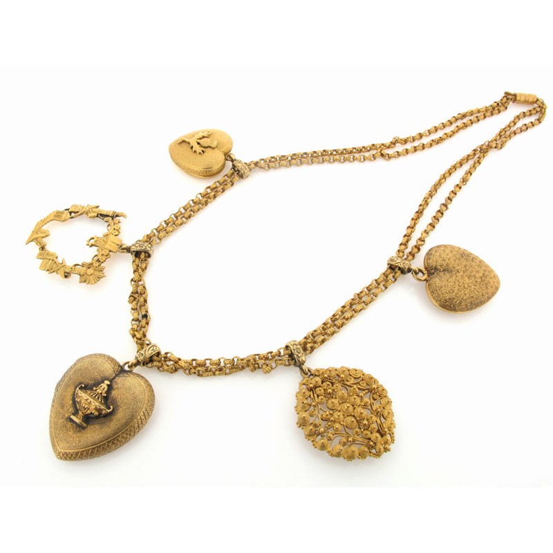 A Regency gold double chain necklace with five assorted gold pendants, including a gold heart shaped gold hinged locket pendant, the front applied with an urn and engraved to the reverse Thomas Earl of Hyndford, died 14th Feb 1811, ever held in remembrance. And a heart shaped hinged gold locket pendant applied with a thistle.