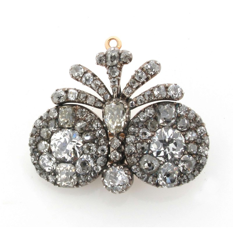 A George III double cluster and spray brooch pendant, each cluster centred with a circular cut diamond within surrounds of smaller graduated stones. The diamond set spray issues from a pear shaped diamond and further circular cut diamond below. Gold and silver mount with later pendant and brooch fittings. 3.3cm wide. Fitted case.