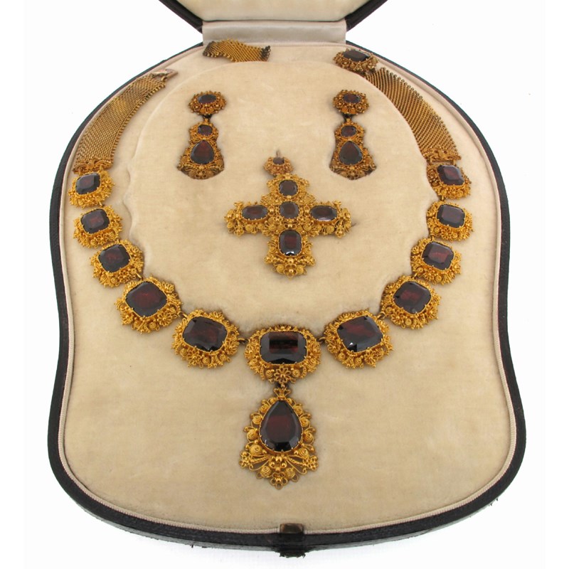 A Victorian suite of garnet set gold jewellery, comprising a necklace, a pair of drop earrings, a cruciform brooch and an additional pendant fitting, all set with flat garnets in gold cannetille mounts. Fitted case by Harvey & Gore.