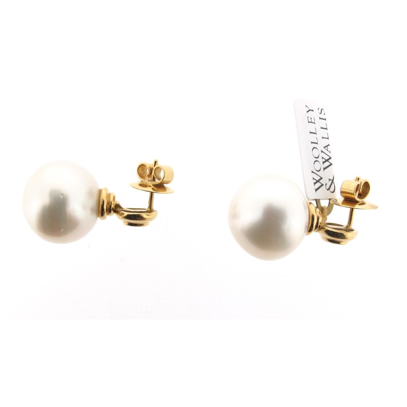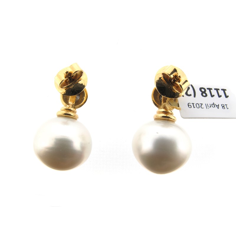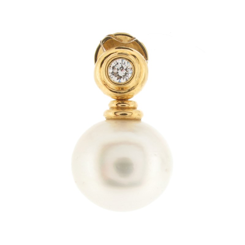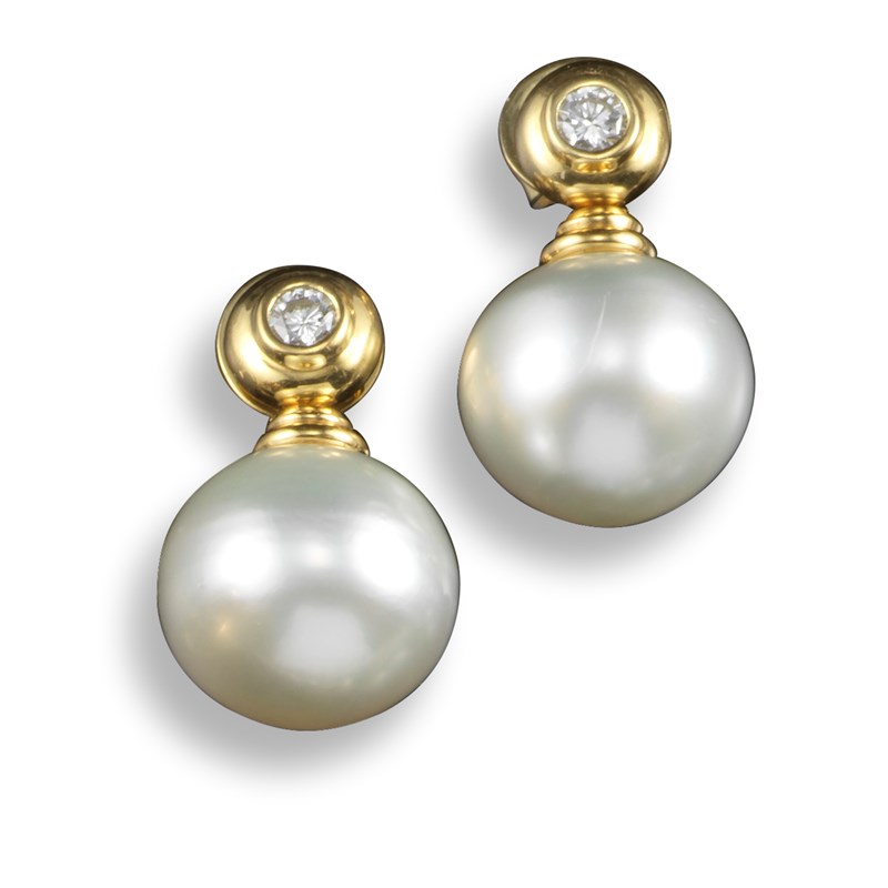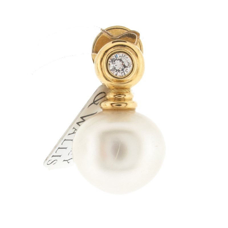 A pair of cultured pearl and diamond earrings, each cultured pearl suspends from a circular-cut diamond rubover-set in yellow gold, post fittings, each 2.5cm high