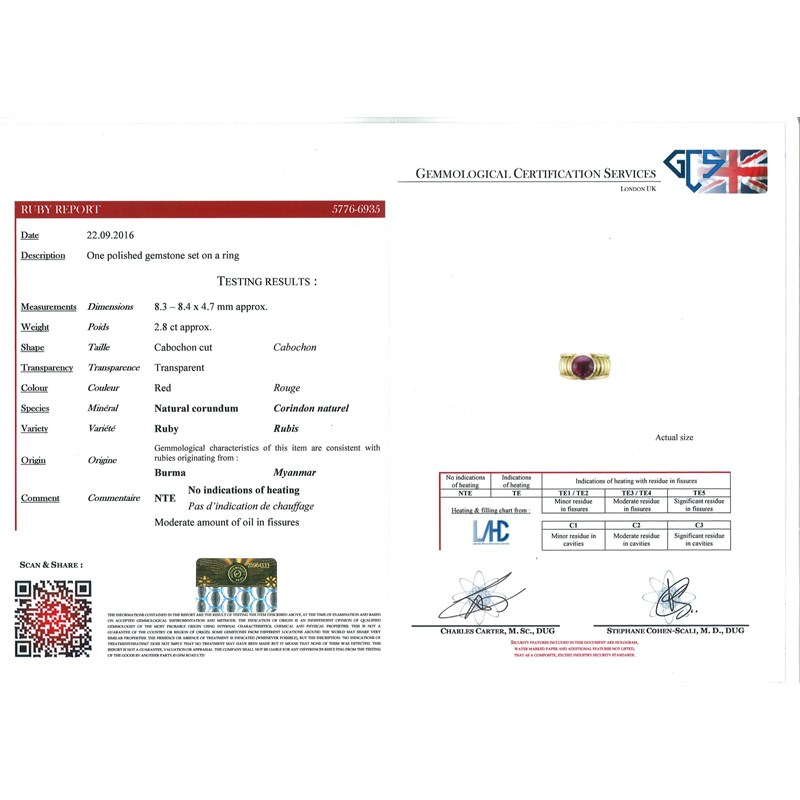 Accompanied by report number 5776-6935 dated 22 September 2016 from GCS, London stating that the cabochon-cut ruby weighs approximately 2.80cts and is a natural ruby with no indications of heat treatment and moderate amount of oil in fissures. Origin: Burma (Myanmar)
