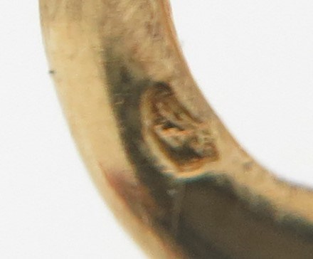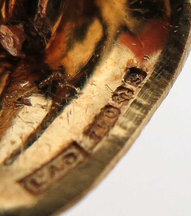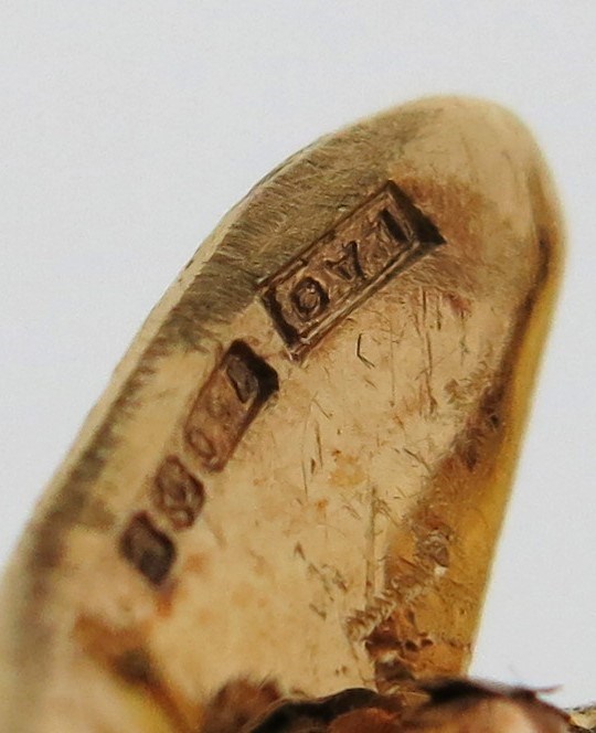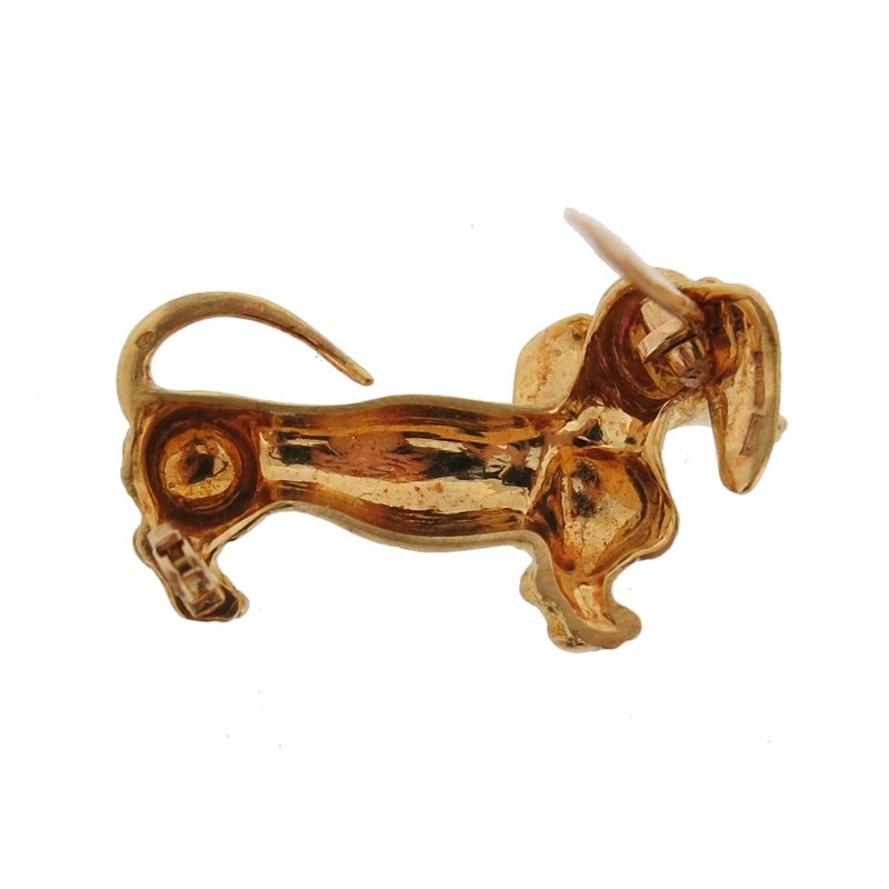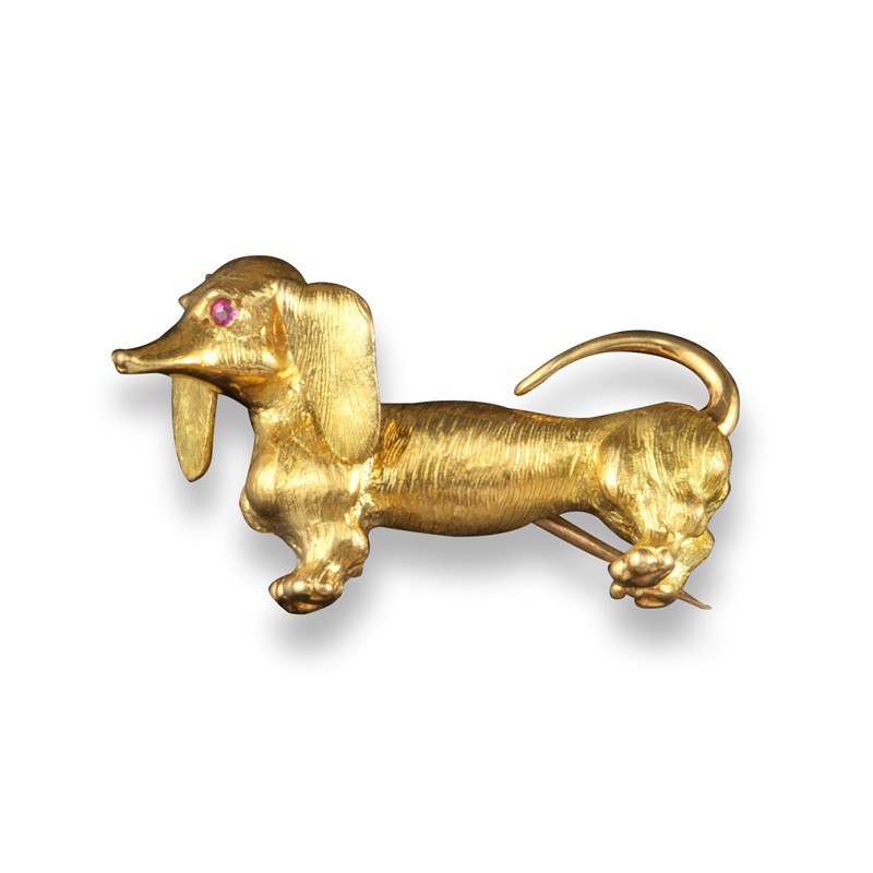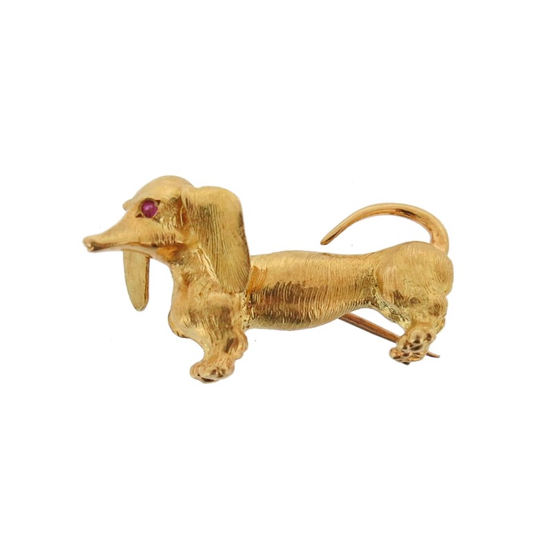 A gold Daschund brooch, realistically formed and set with ruby eyes in yellow gold, 4cm wide