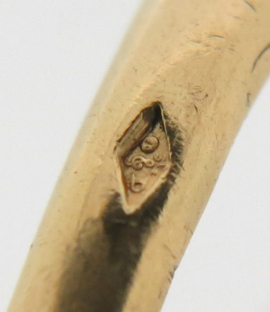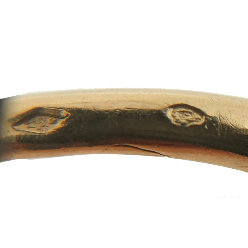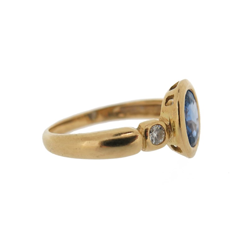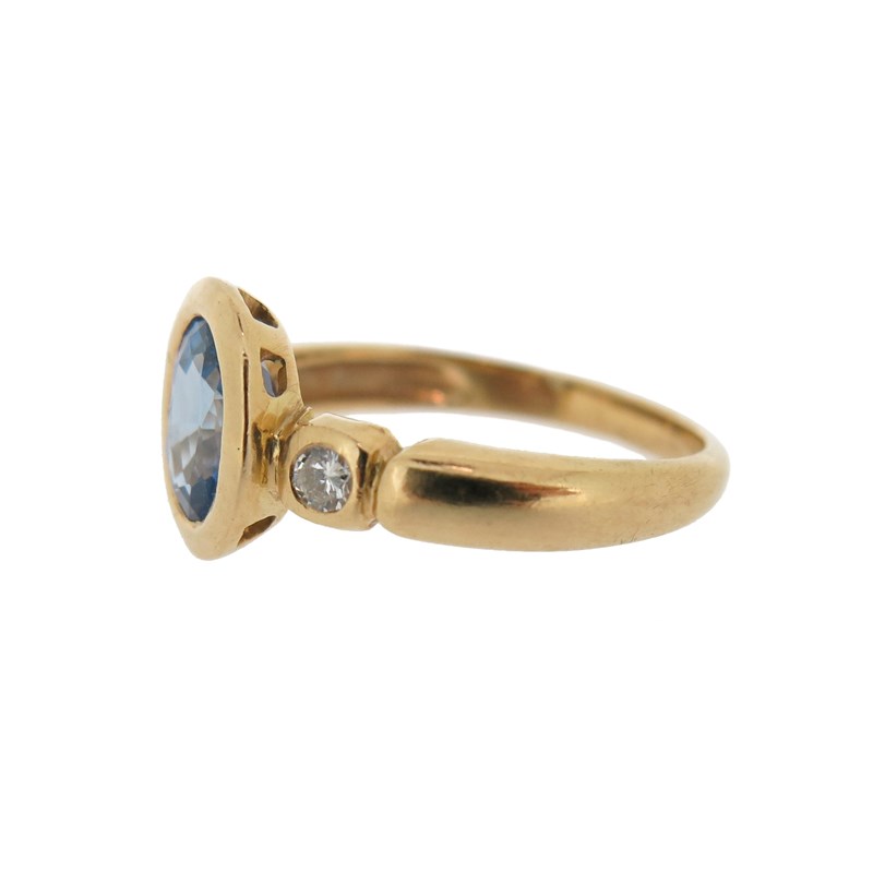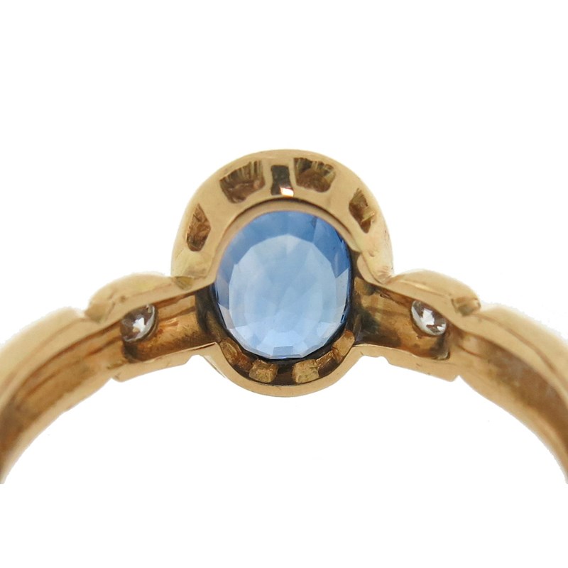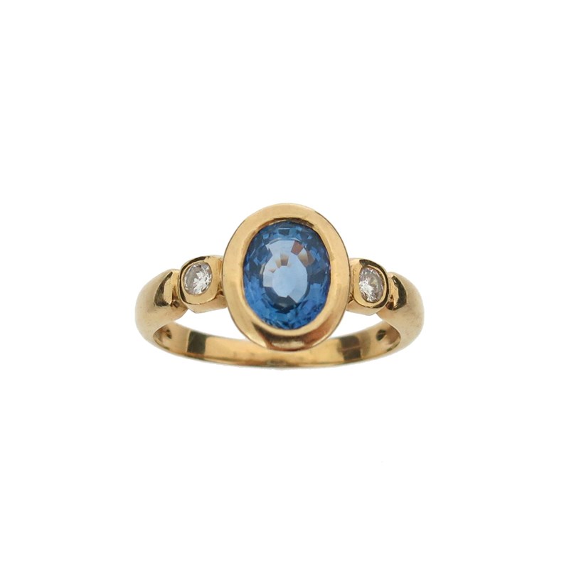 A French sapphire and diamond three-stone ring, the oval-shaped sapphire is rubover-set with circular-cut shoulder diamonds in yellow gold, with French control mark and maker's lozenge 'Ste O & D', size X