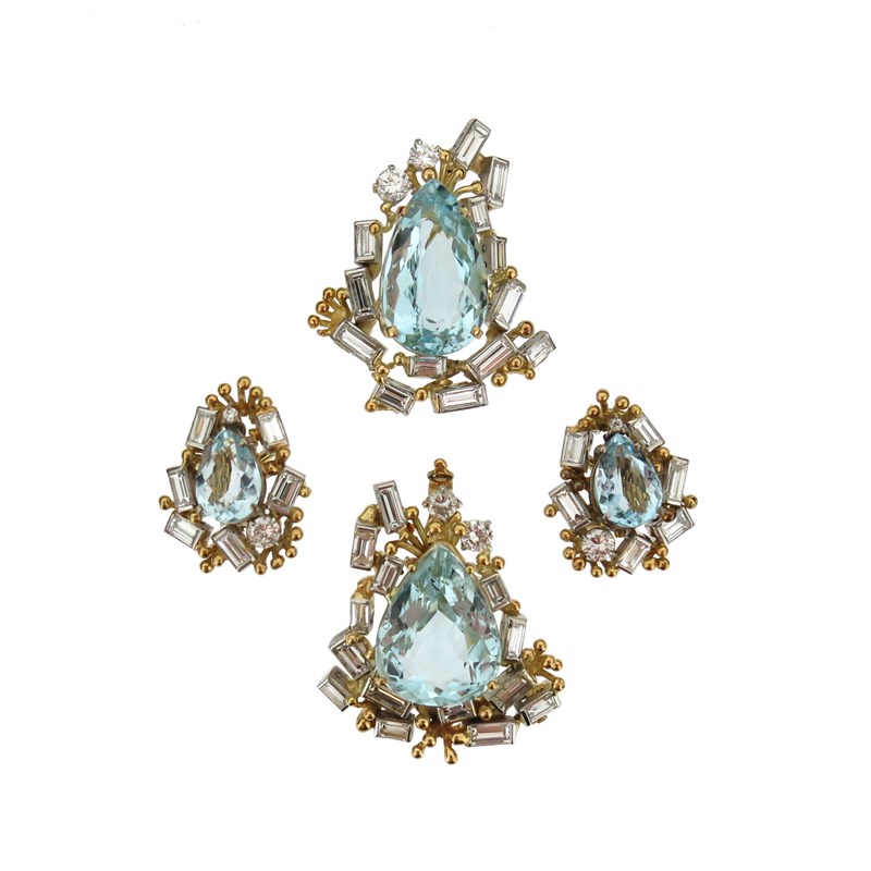 An abstract blue topaz and diamond pendant, the pear-shaped blue topaz set within gold pellet border and graduated baguette-shaped and circular-cut diamonds in yellow gold and platinum, 3.8cm high, with a matching blue topaz and diamond brooch, 4cm wide and a pair of aquamarine and diamond earrings, clip fittings, 2.5cm high