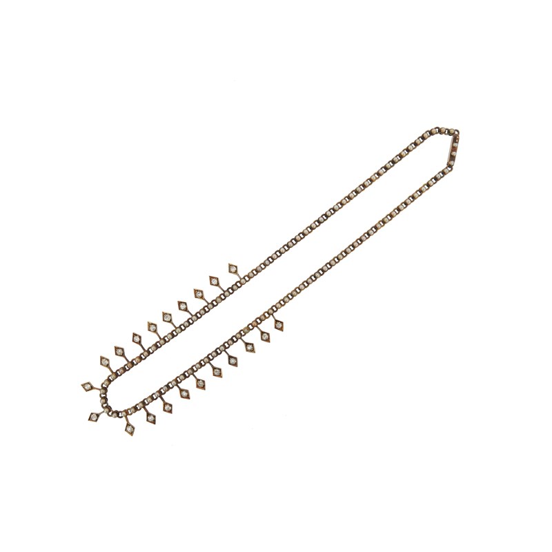 An early 20th century seed pearl and diamond fringe necklace, the circular links alternately-set with seed pearls suspending lozenge-shaped links set with diamonds in yellow gold, 38cm long