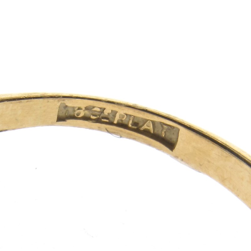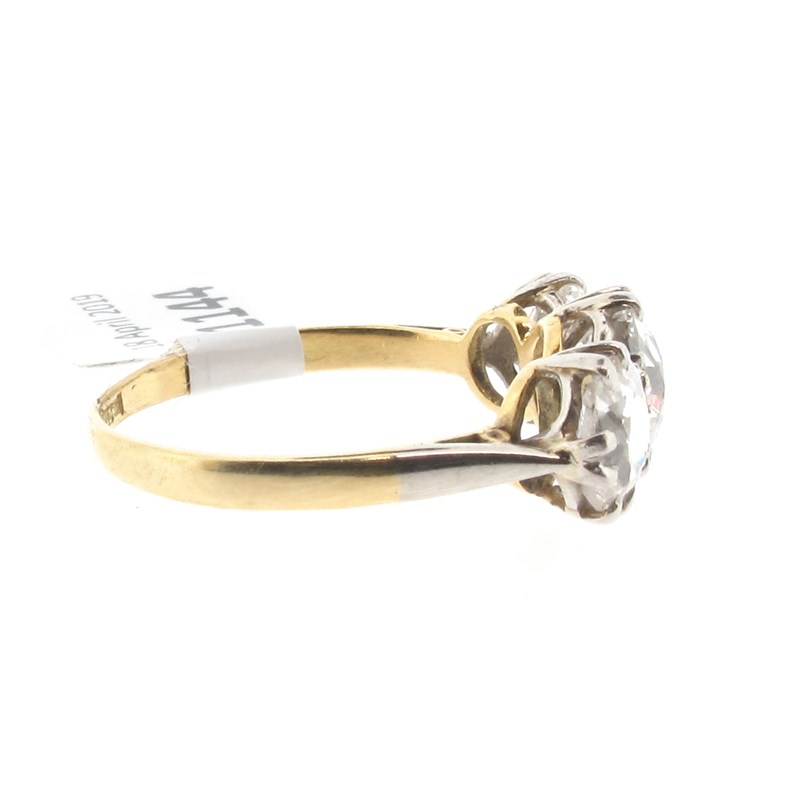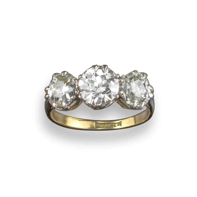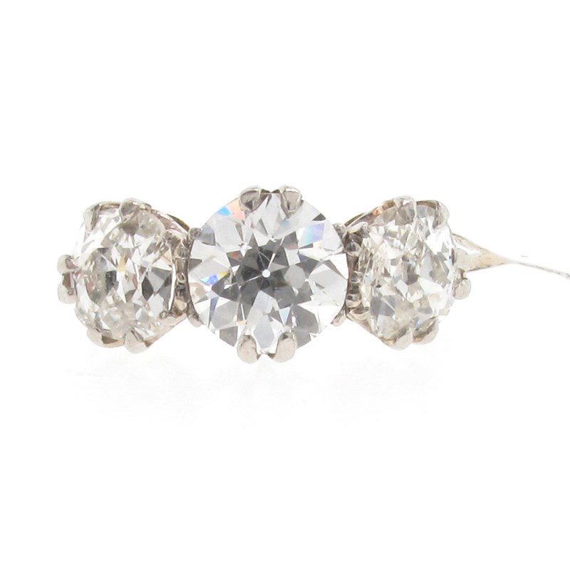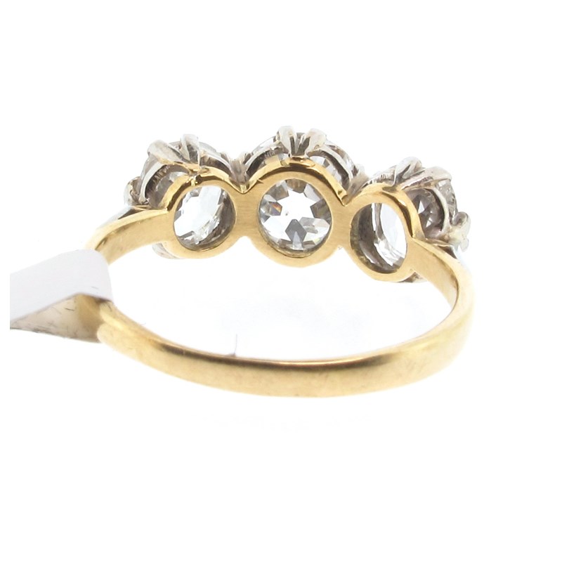 A diamond three-stone ring, the three graduated circular-cut and cushion-shaped diamonds weigh approximately 2.50cts in total, set in platinum and yellow gold, size M 1/2