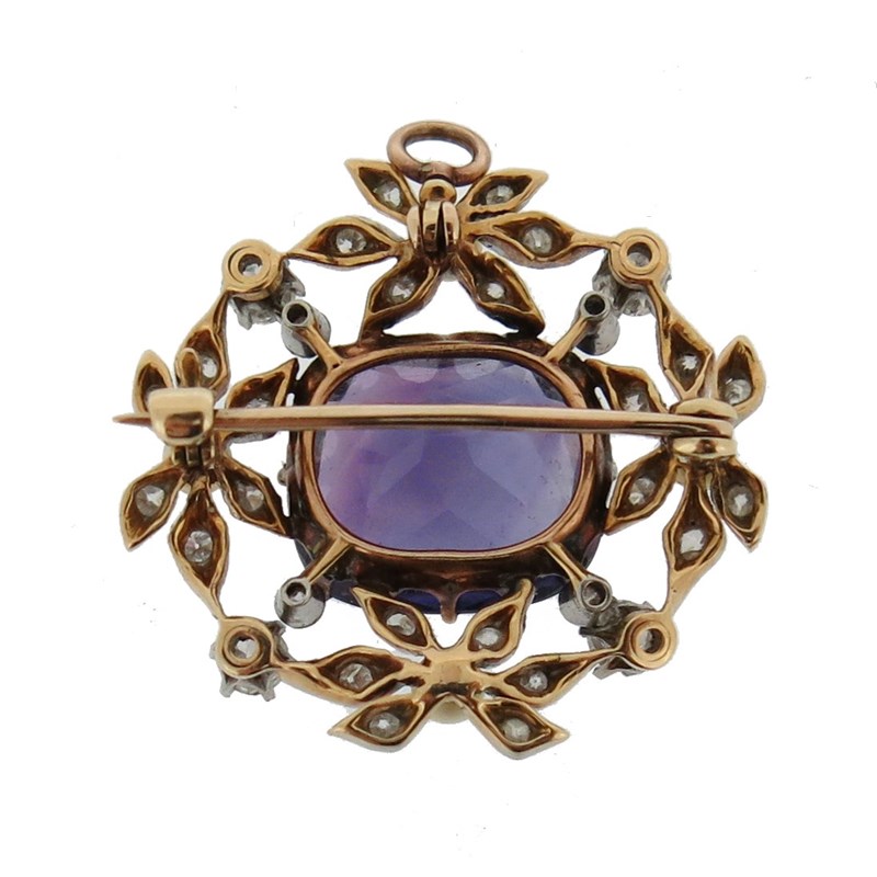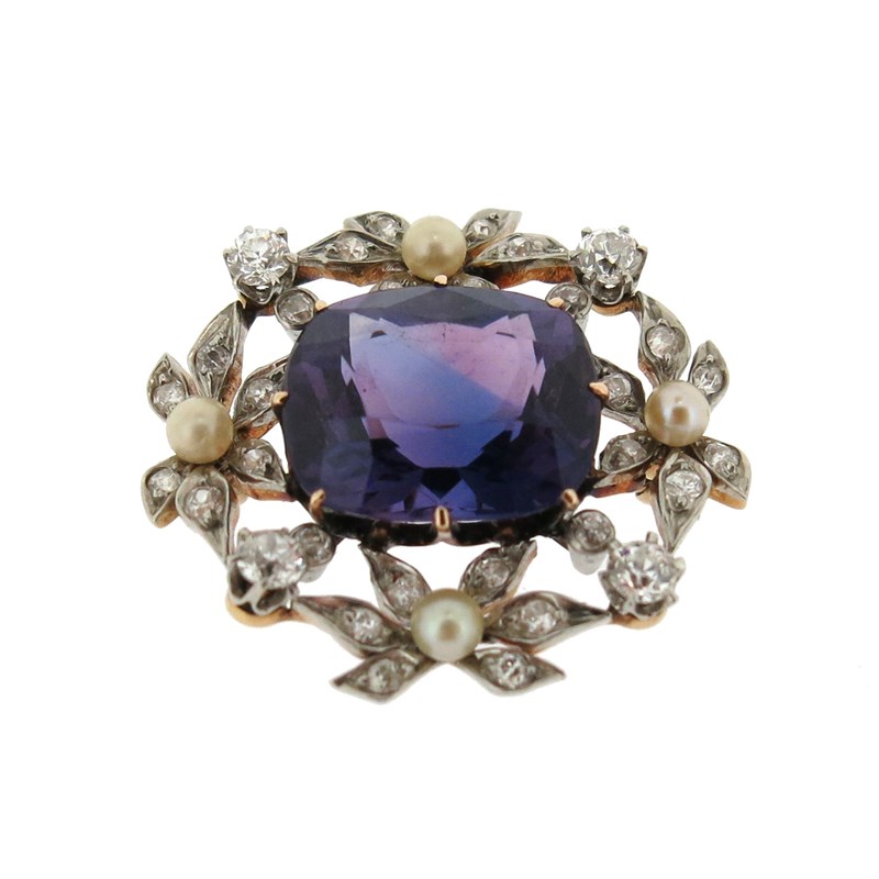 An early 20th century amethyst and diamond brooch, the cushion-shaped amethyst set within foliate borders set with diamonds and seed pearls in platinum and yellow gold, folding pendant loop, 2.8cm wide, case