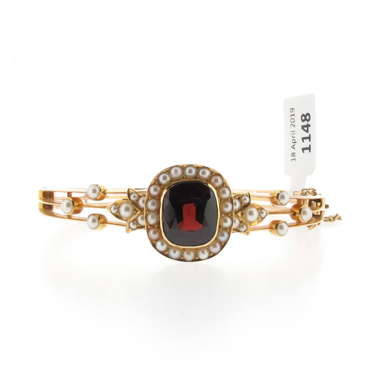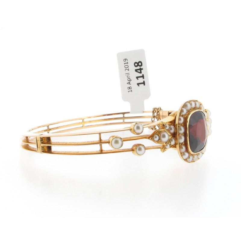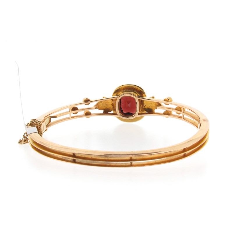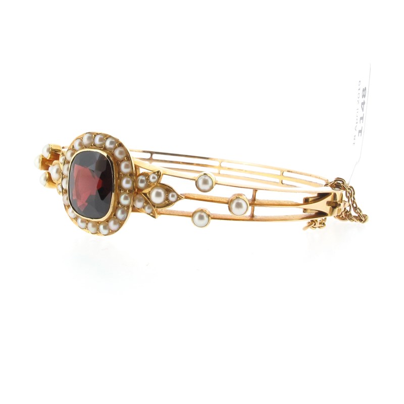 An Edwardian garnet and seed pearl bangle, the cushion-shaped garnet is set within a surround of seed pearls in yellow gold, 5.5cm inner diameter