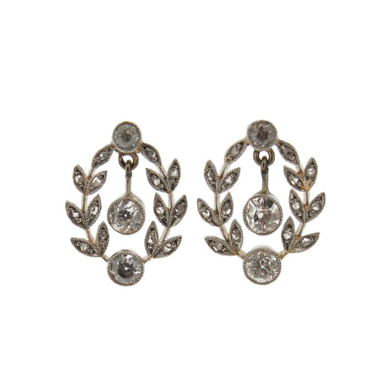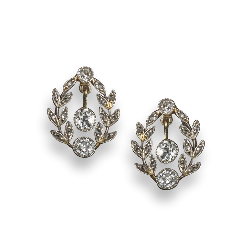 A pair of Belle Epoque diamond earrings, designed as diamond-set laurels with graduated diamond terminals and an articulated diamond centre in platinum and white gold, later post fittings, 1.5cm high, case