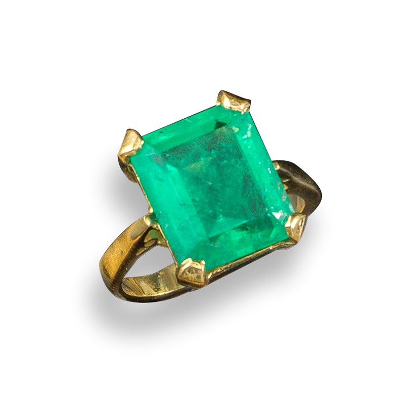 An emerald solitaire ring, the emerald-cut emerald is set in 18ct yellow gold, size Q