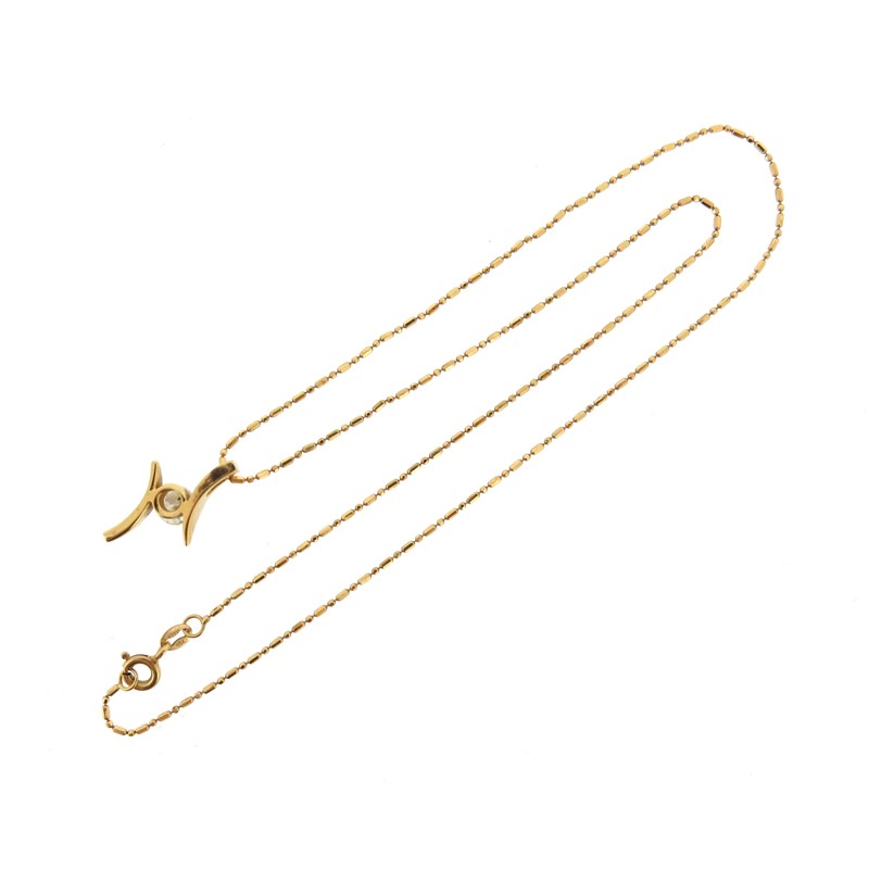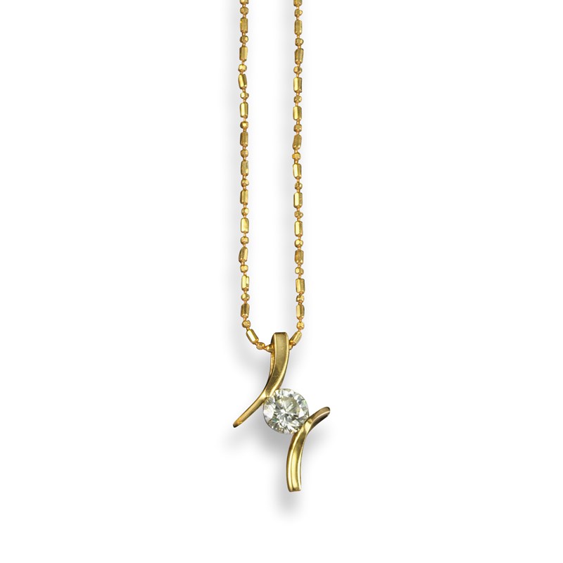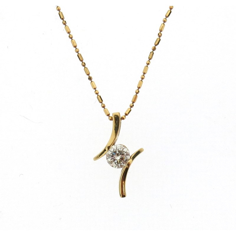A diamond solitaire pendant, the round brilliant-cut diamond weighs approximately 0.50cts, set in yellow gold asymmetrical mount on fine-link gold chain, 19.5cm long