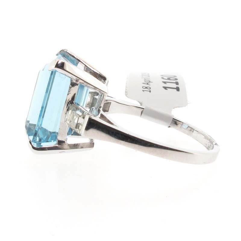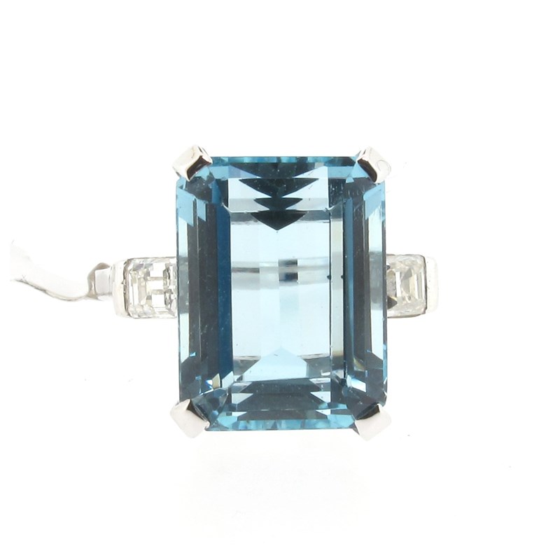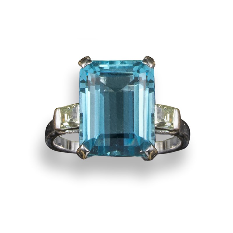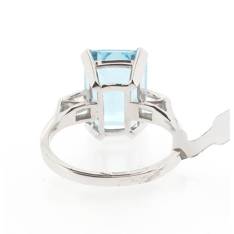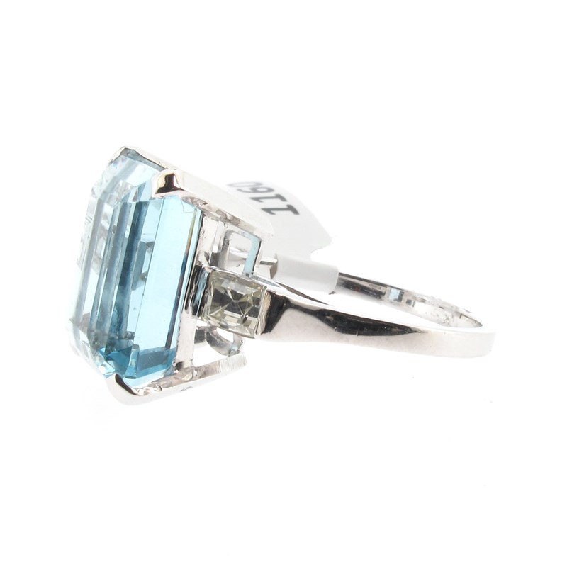 An aquamarine and diamond cluster ring, the emerald-cut aquamarine weighs approximately 6.90cts and set with square-shaped shoulder diamonds in platinum, size P