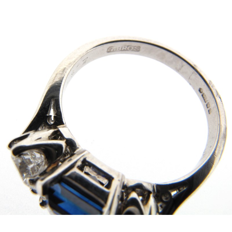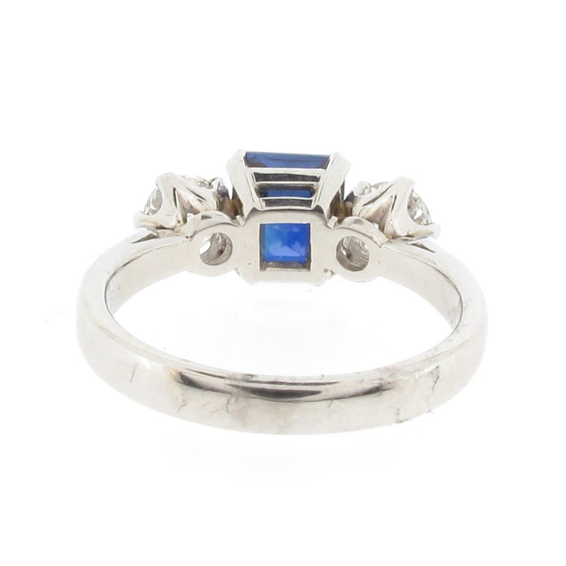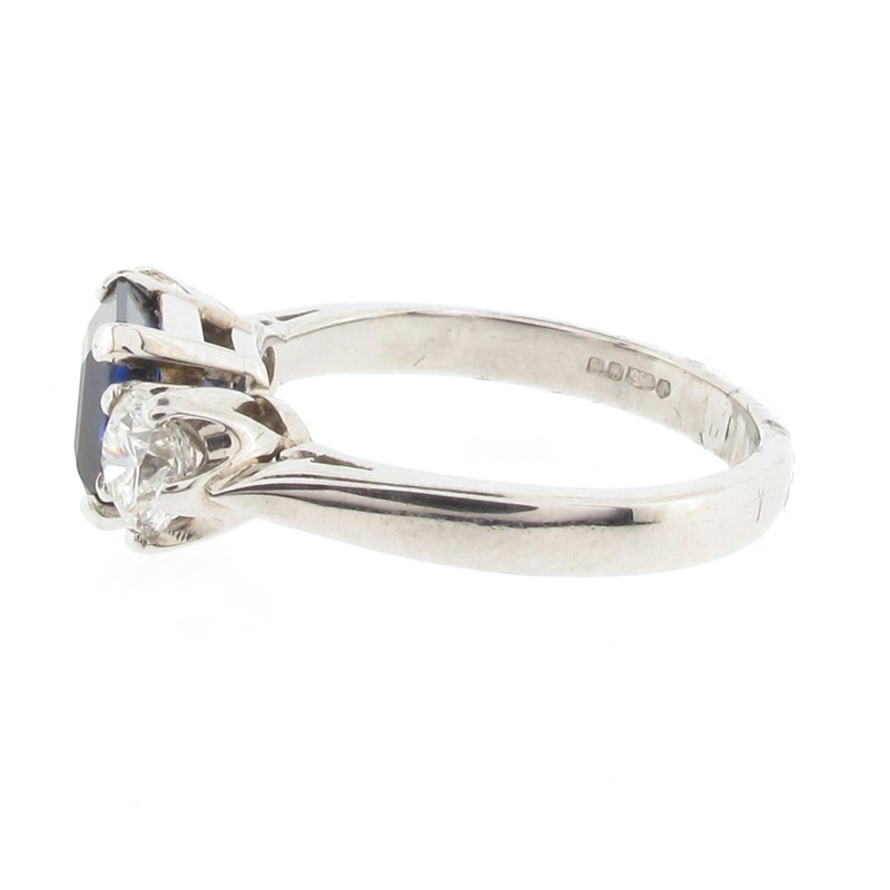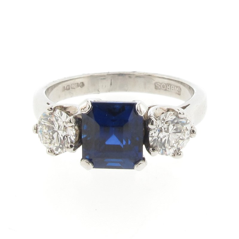 A sapphire and diamond three-stone ring, the square-shaped sapphire is set with two round brilliant-cut diamonds in platinum, with London hallmarks for 2005 and maker's mark G.BROS, size L