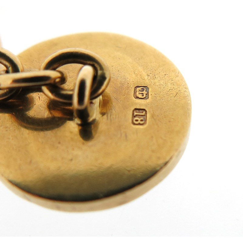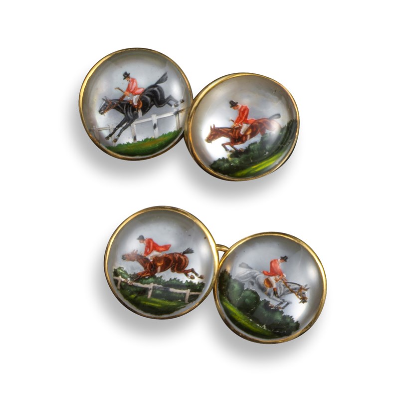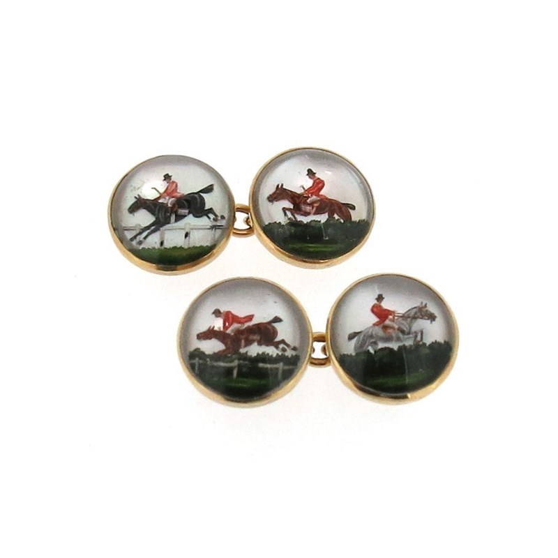 A pair of reverse-carved crystal cufflinks, depicting Jockeys riding horses in 18ct yellow gold circular mounts, London hallmarks for 1954 and marked AP