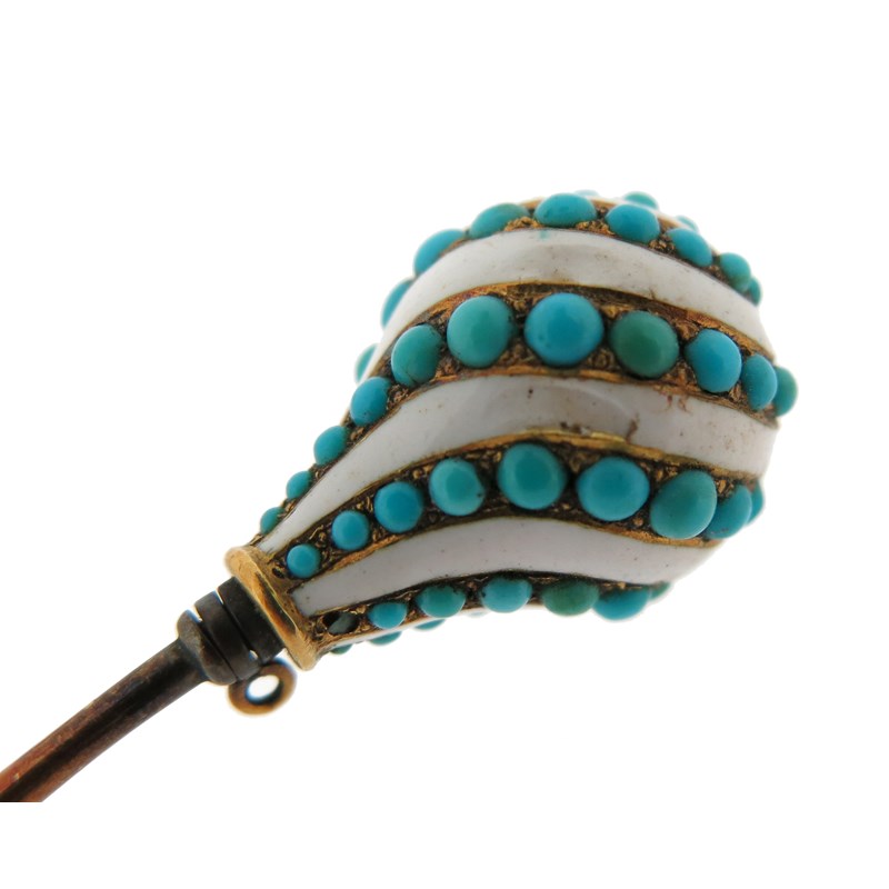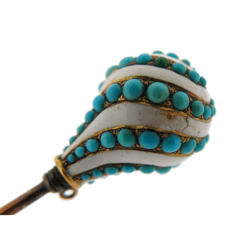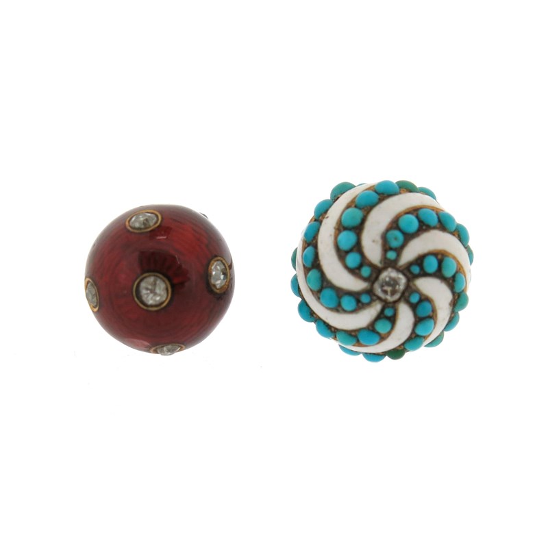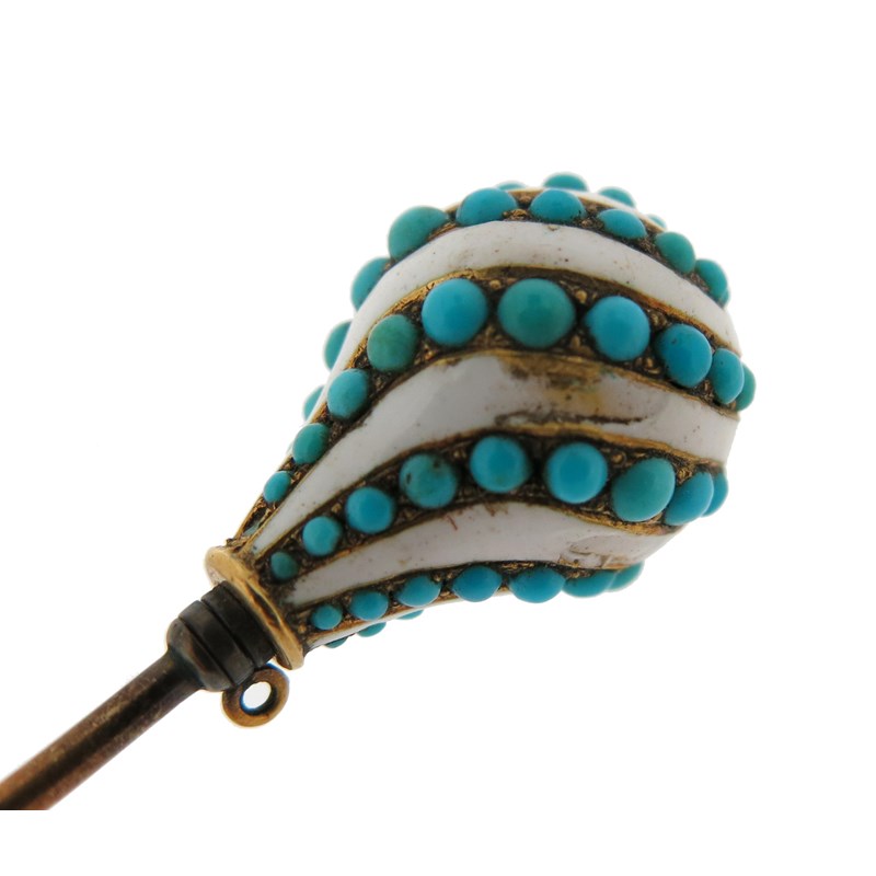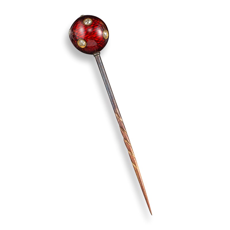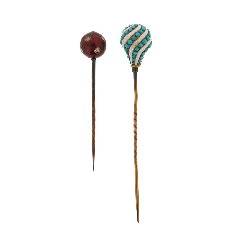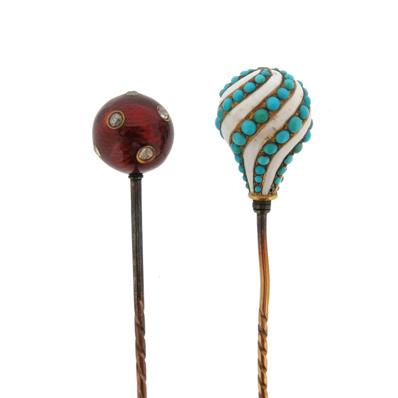 A gold and enamel spherical stick pin, set with diamonds in red guilloche enamel, 6.5cm high, with a turquoise and white enamel (damaged) stick pin, set with a diamond top in gold, 9cm high