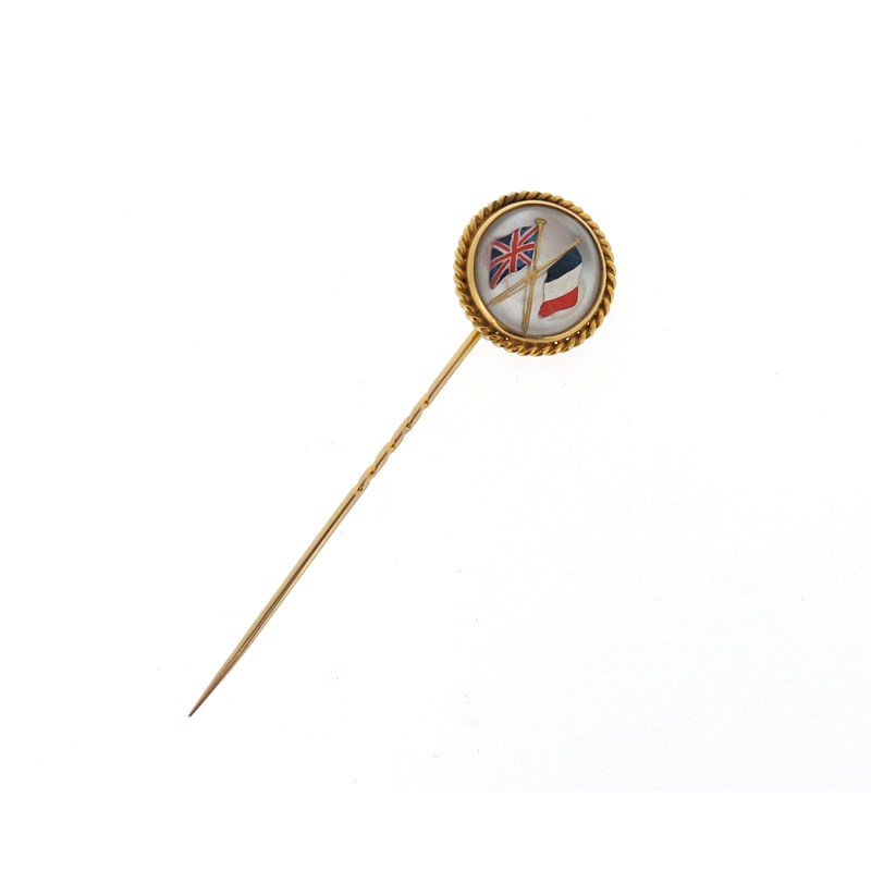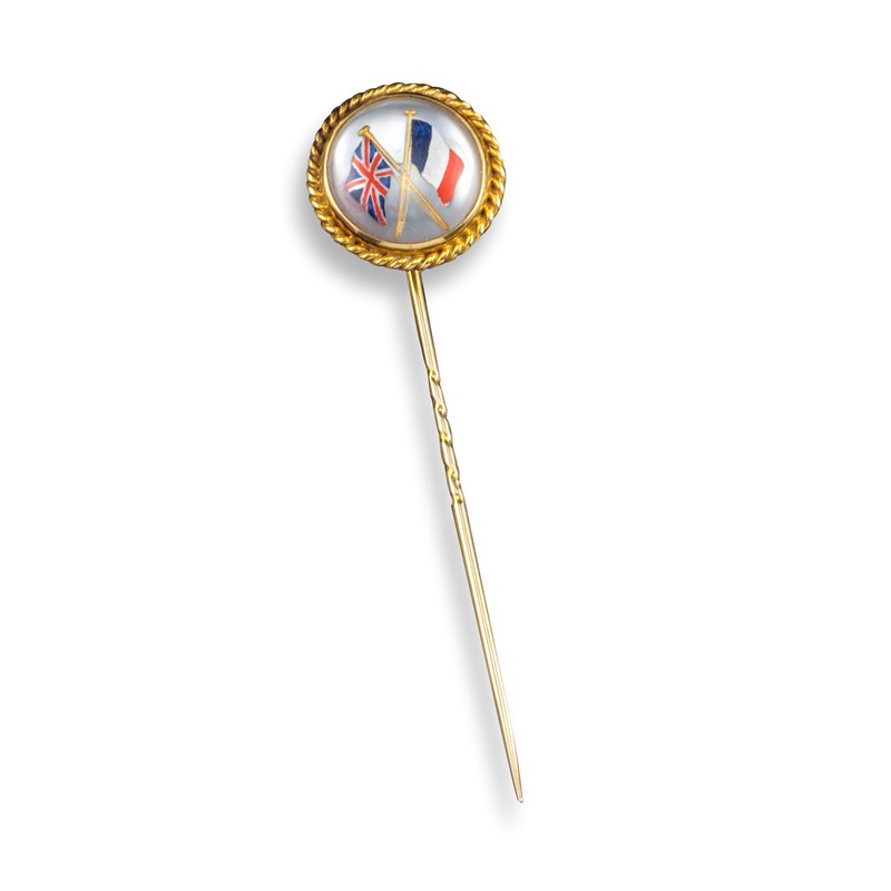 A reverse-carved crystal gold stick pin, depicting the Union Flag and French Tricolour within a gold circular ropetwist border, 7cm high, case