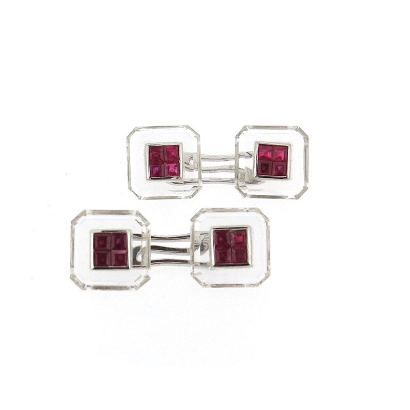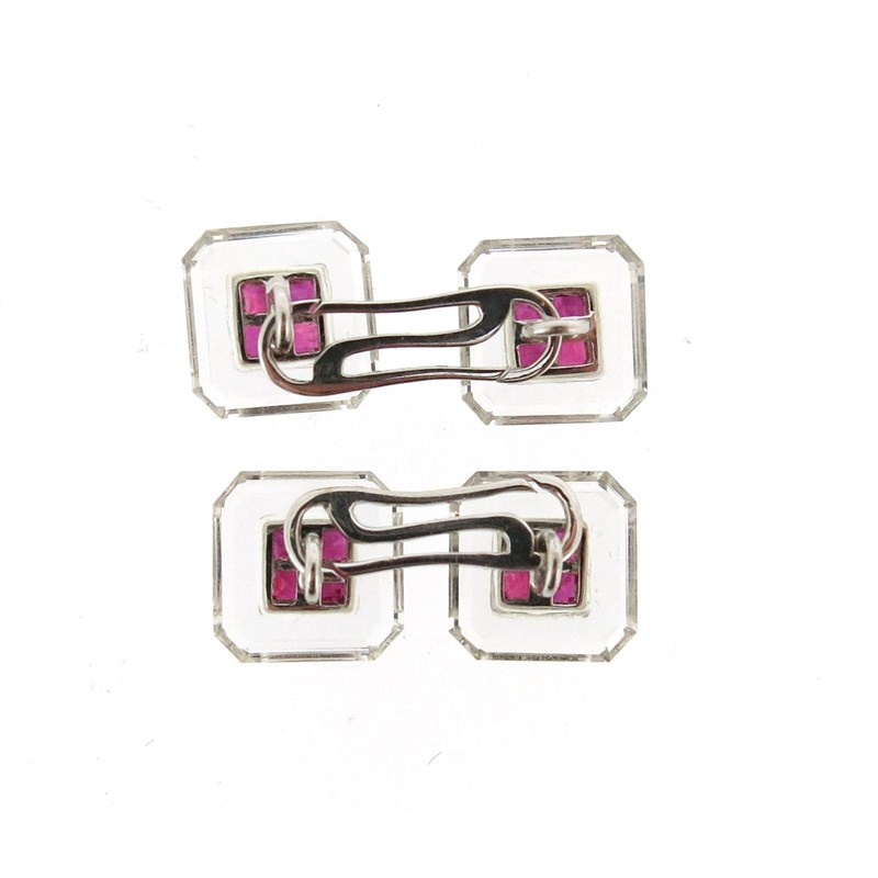 A pair of rock crystal and ruby cufflinks, each octagonal link set with four calibre-cut rubies in white gold