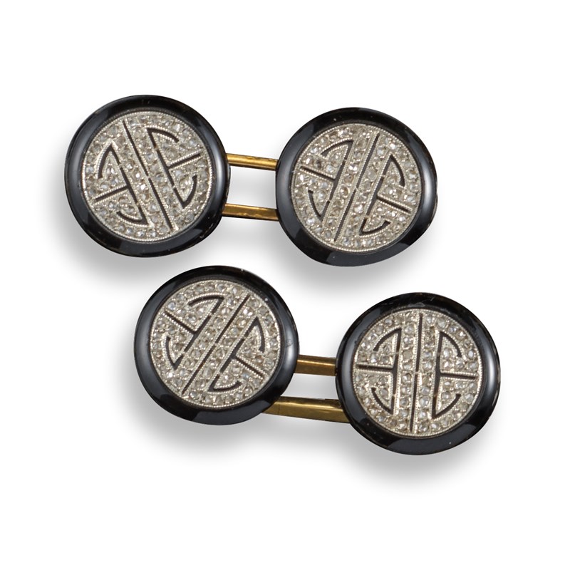 A pair of Art Deco onyx and diamond cufflinks, of geometric design, millegrain-set with diamonds in platinum on black onyx discs, gold fittings, Boucheron case, with a pair of matching studs, case