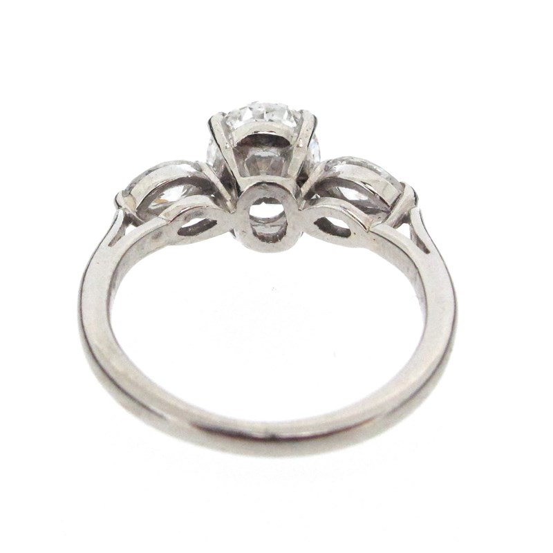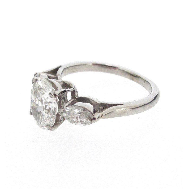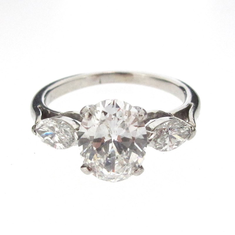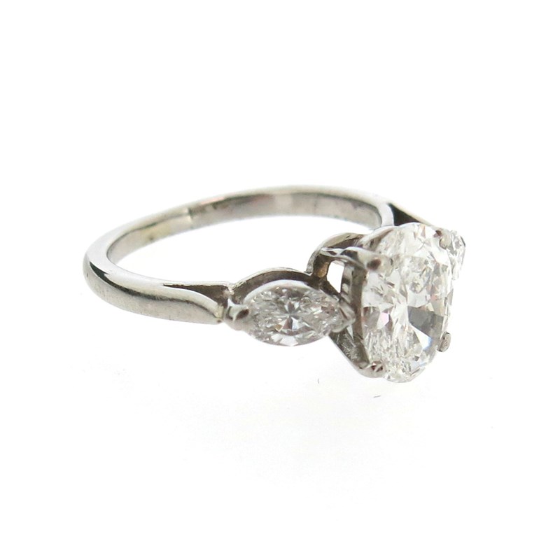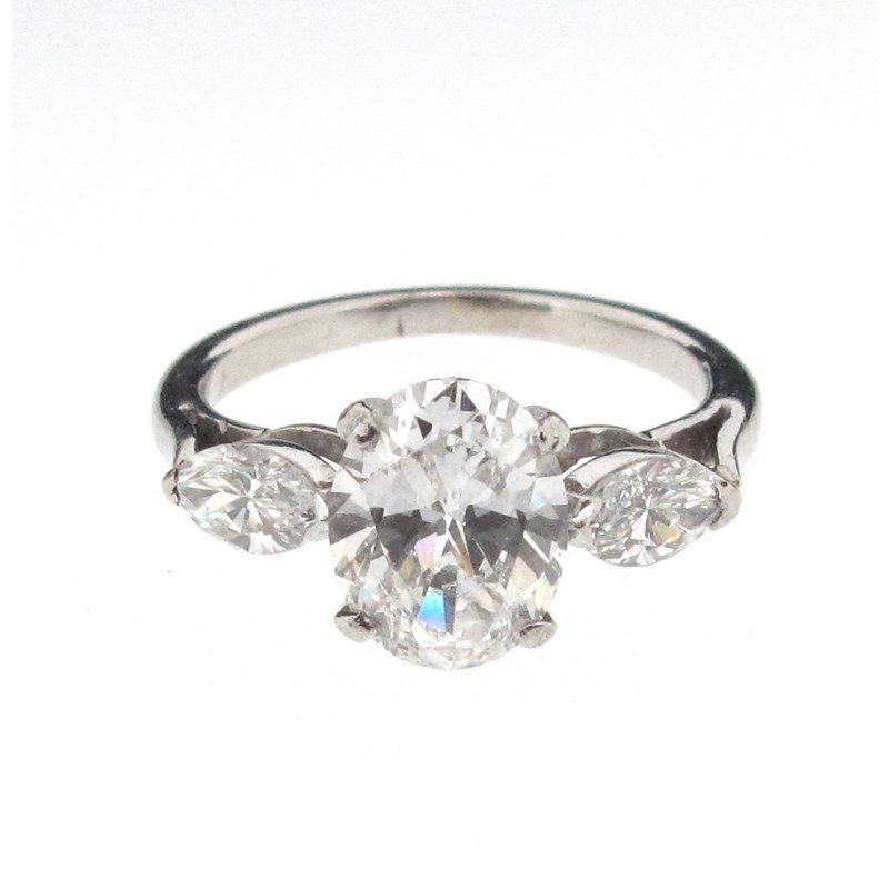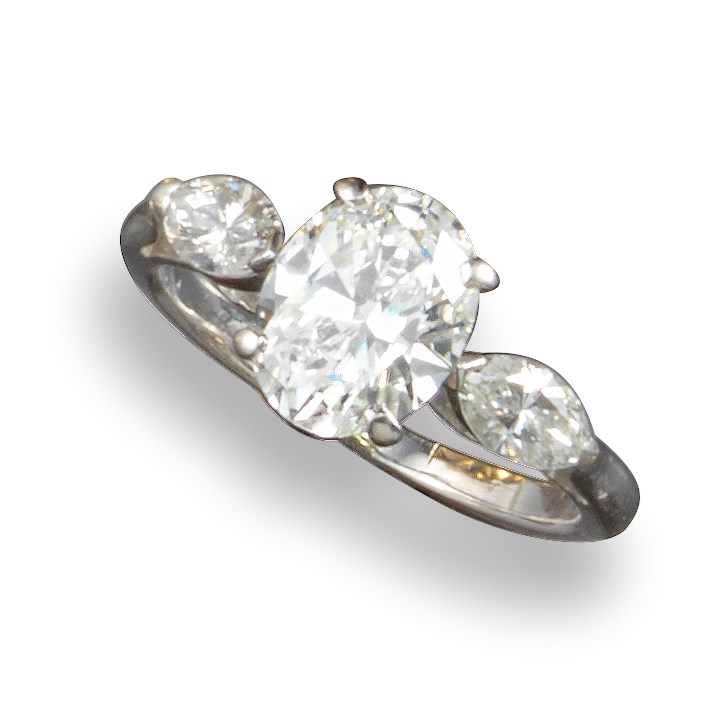 A diamond three-stone ring, the oval-shaped diamond weighs 1.43 ct and is set with two marquise-shaped shoulder diamonds in platinum, size I