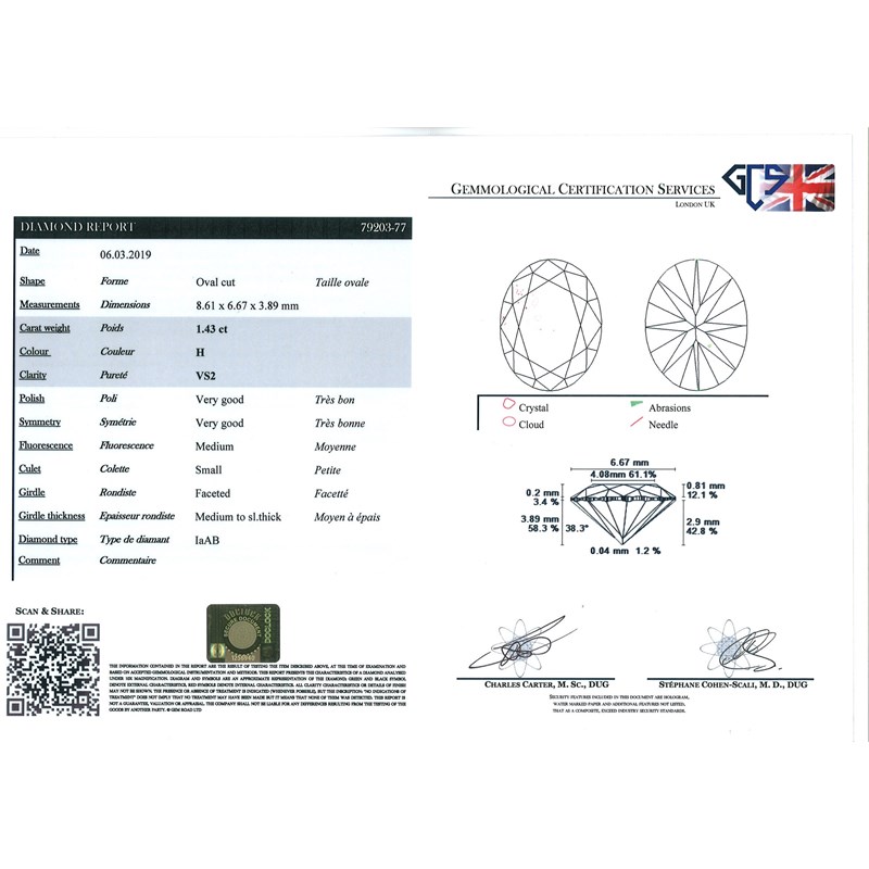 Accompanied by report number 79203-77 dated 6 March 2019 from GCS, London stating that the oval-shaped diamond weighs 1.43cts and is a natural diamond with H colour and VS2 clarity. Type IaAB. Fluorescence: medium.