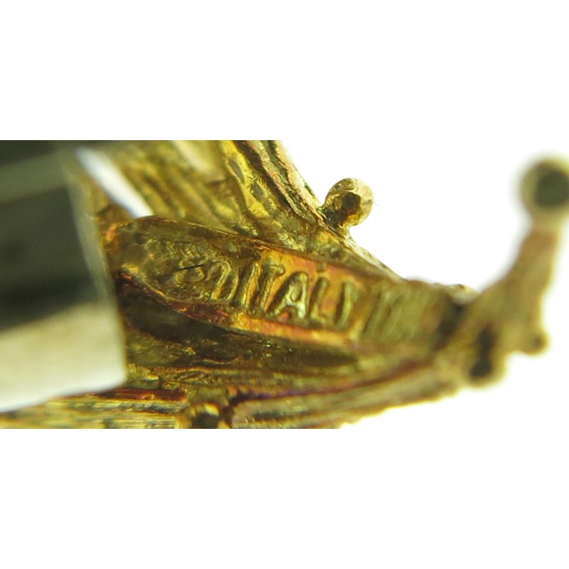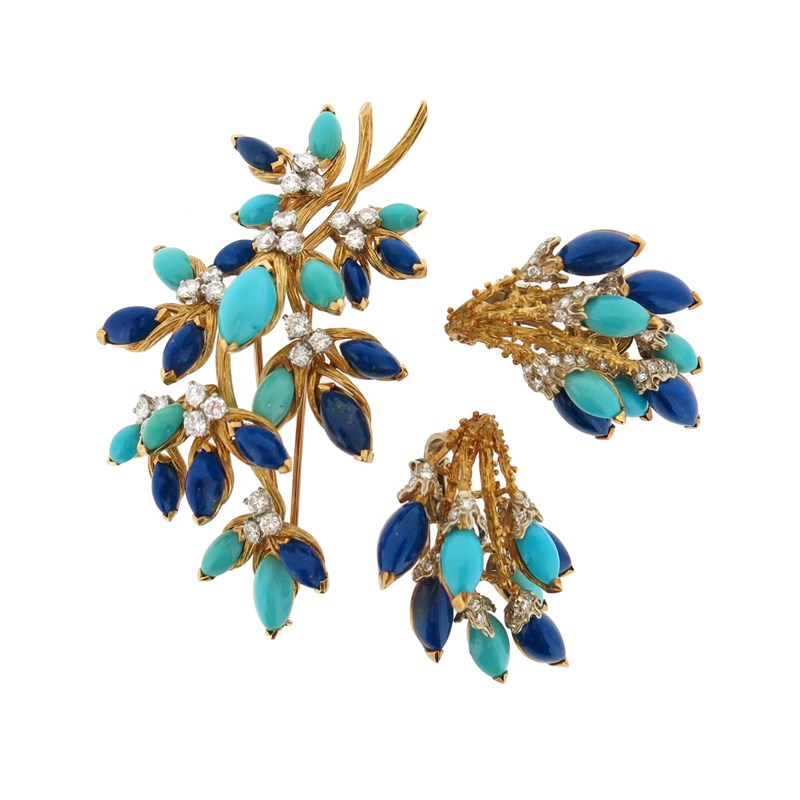 A turquoise lapis lazuli and diamond brooch by Fred, set in textured yellow gold, signed Fred Paris with French control marks and rubbed maker's lozenge, 8cm high, with a pair of similar earrings, set with turquoise, diamonds and lapis lazuli in textured yellow gold, stamped Italy 18k, clip fittings, 4cm