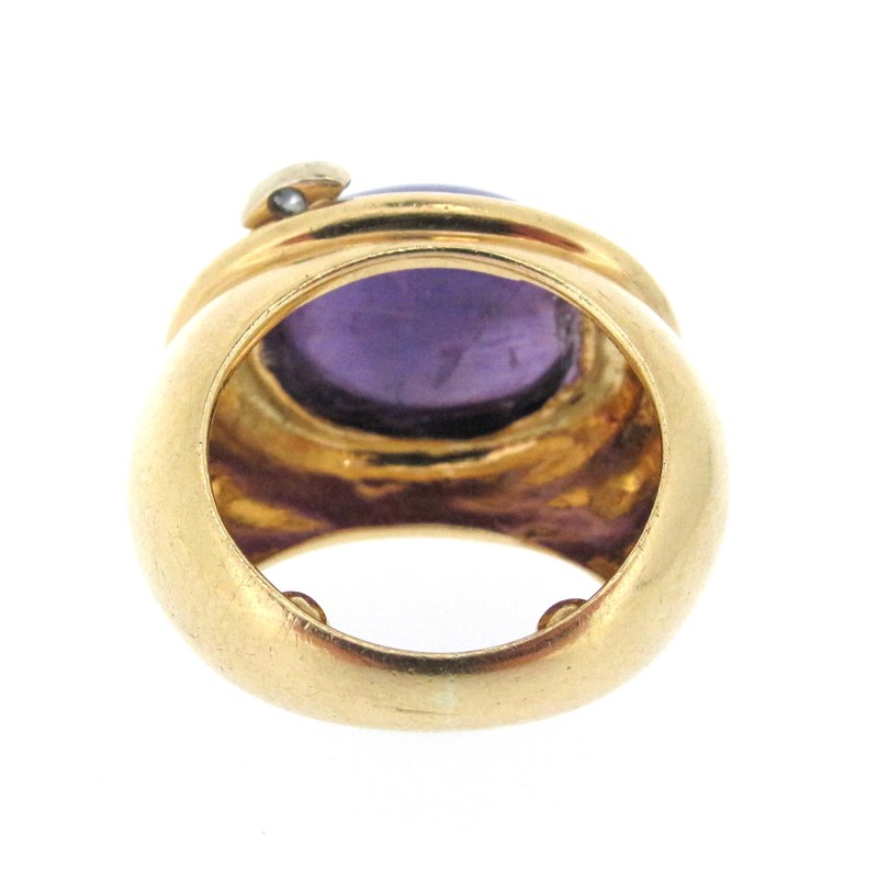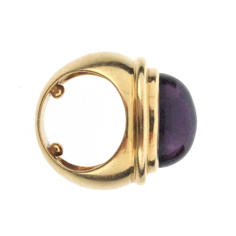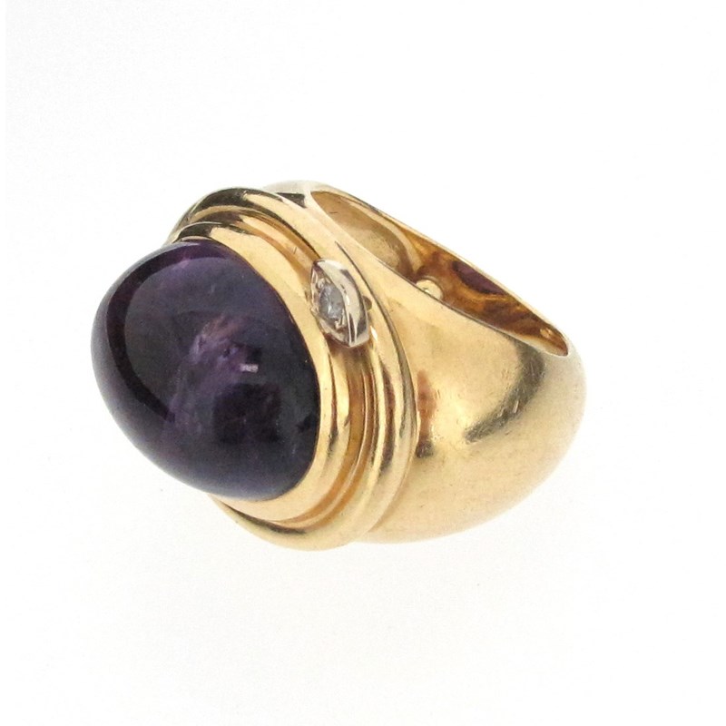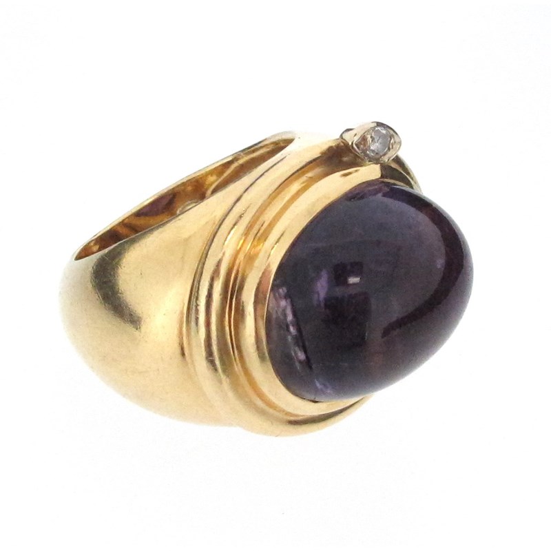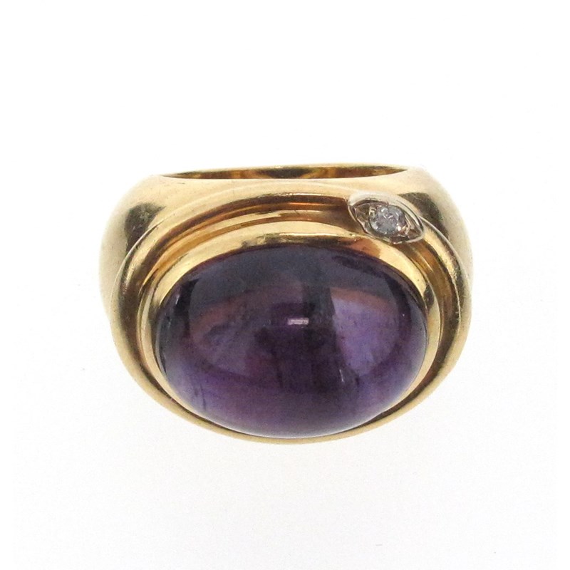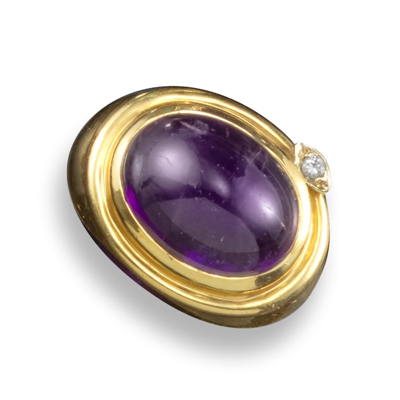 An amethyst and diamond gold ring, horizontally rubover-set with an amethyst cabochon and a circular-cut diamond in a tapered yellow gold mount, with inner resizing balls, size C approx.