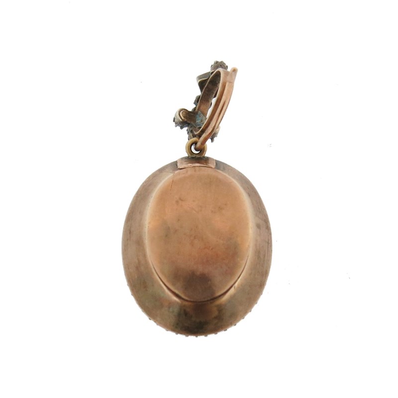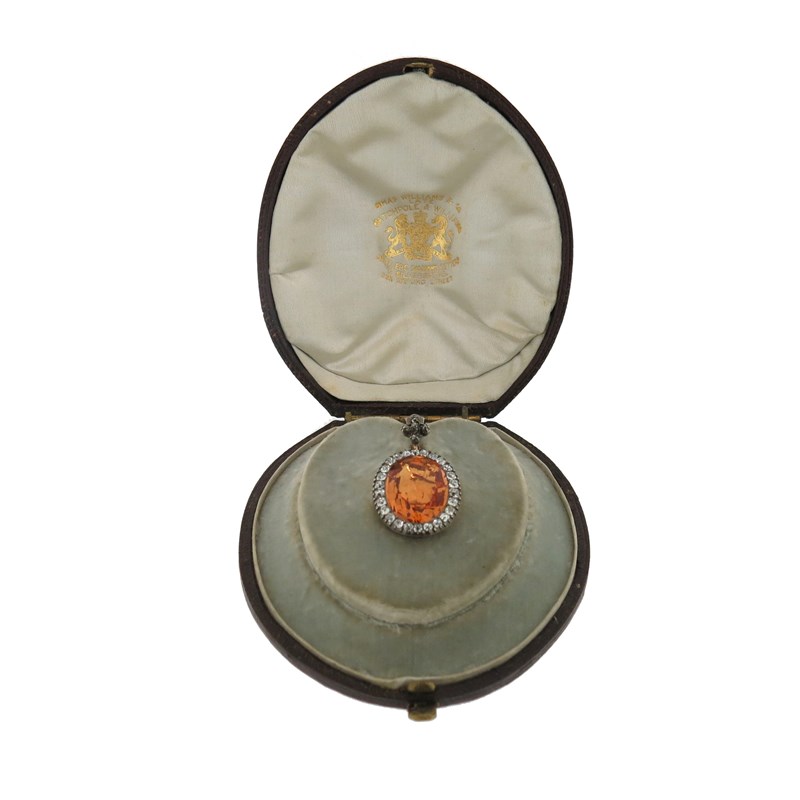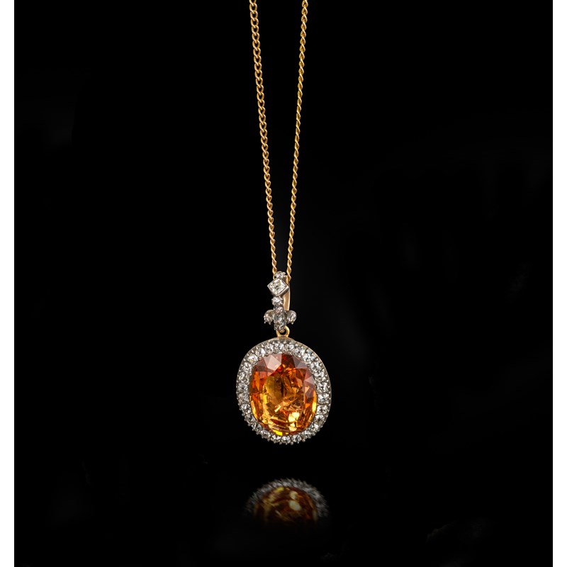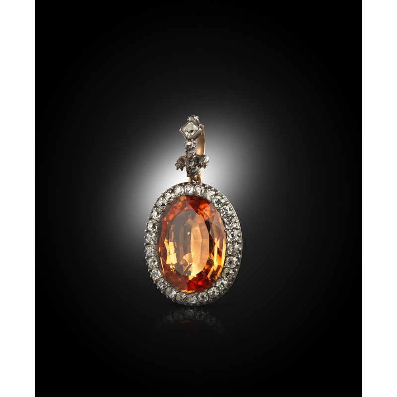 A George III orange topaz and diamond pendant, the oval-shaped topaz weighs approximately 16.00cts, set within a surround of cushion-shaped diamonds in closed-back gold and silver mount, suspended from a diamond-set crucifix bale, on fine-link gold neck chain, pendant 4cm long, fitted case