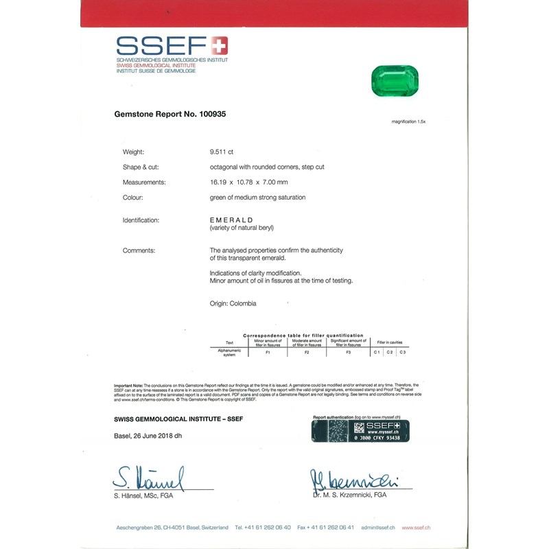 Accompanied by report number 100935 dated 26 June 2018 from SSEF, Switzerland stating that the octagonal step-cut emerald weighs 9.511cts and is a natural emerald with minor clarity enhancement. Origin: Colombia