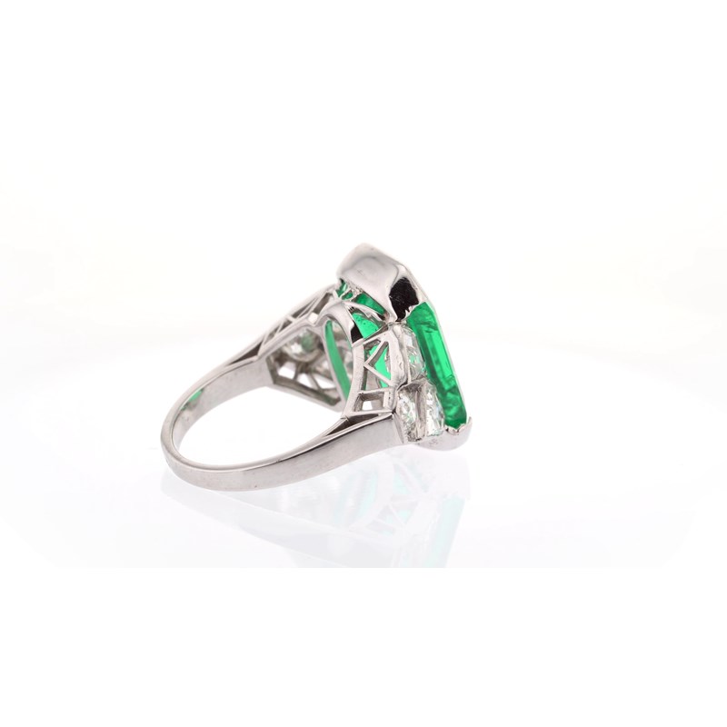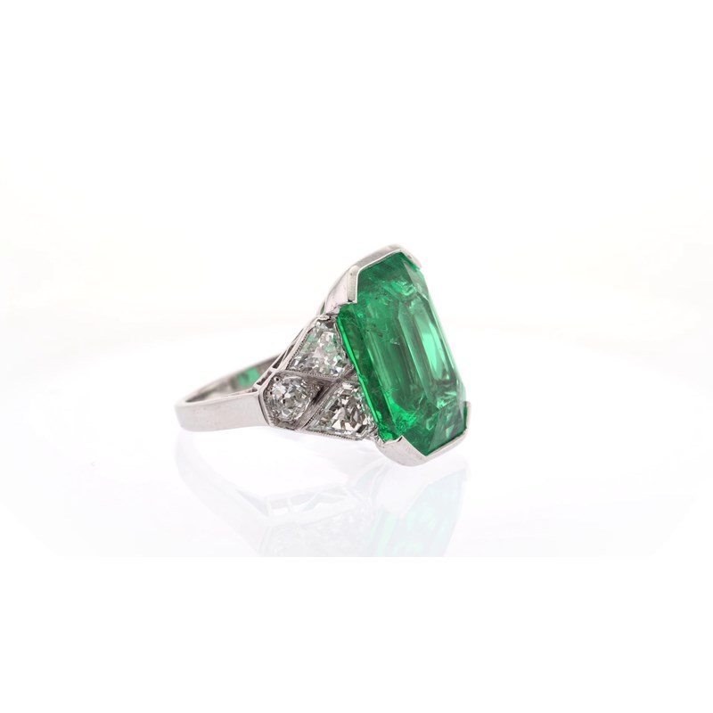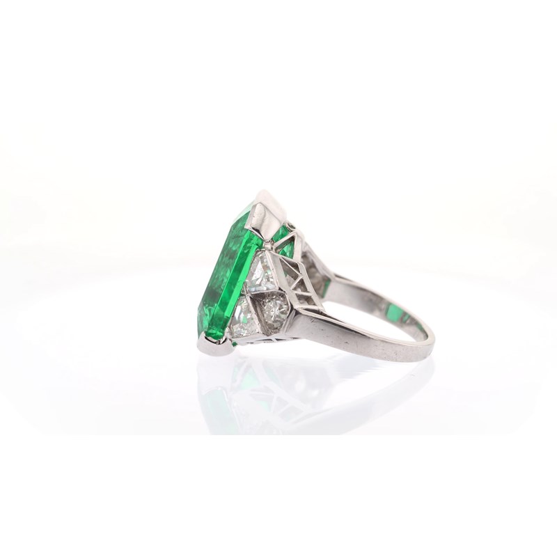 An impressive French emerald and diamond ring, the emerald-cut emerald is set in platinum with a circular-cut and two kite-shaped diamonds to each shoulder, exterior French control mark, size I 1/2