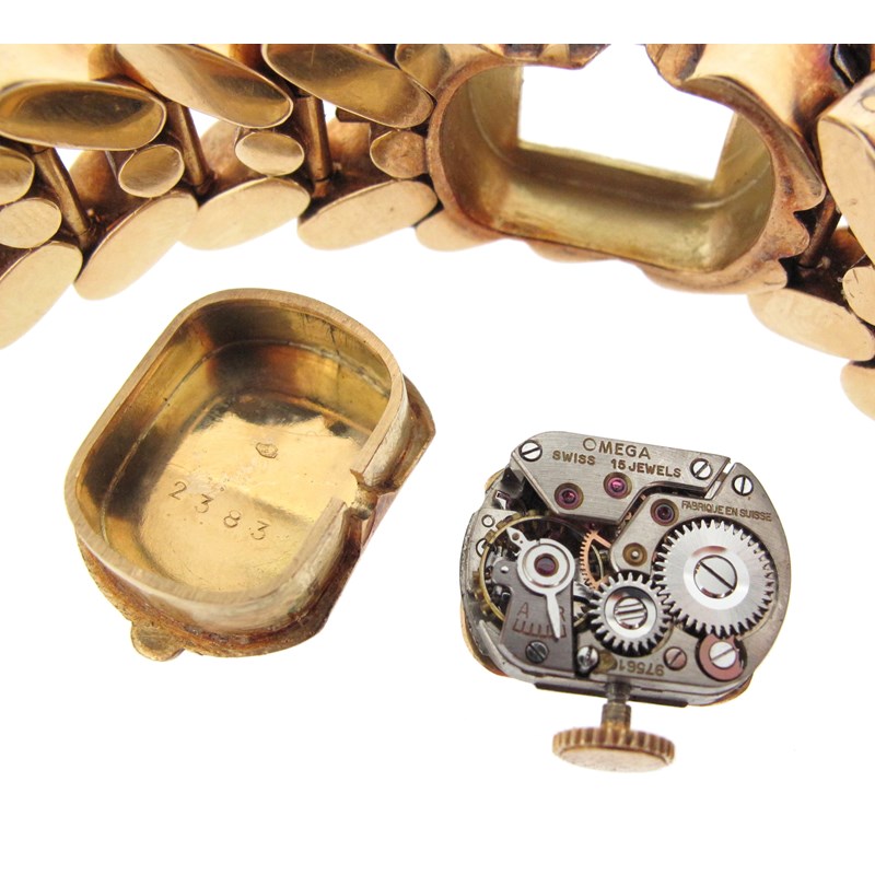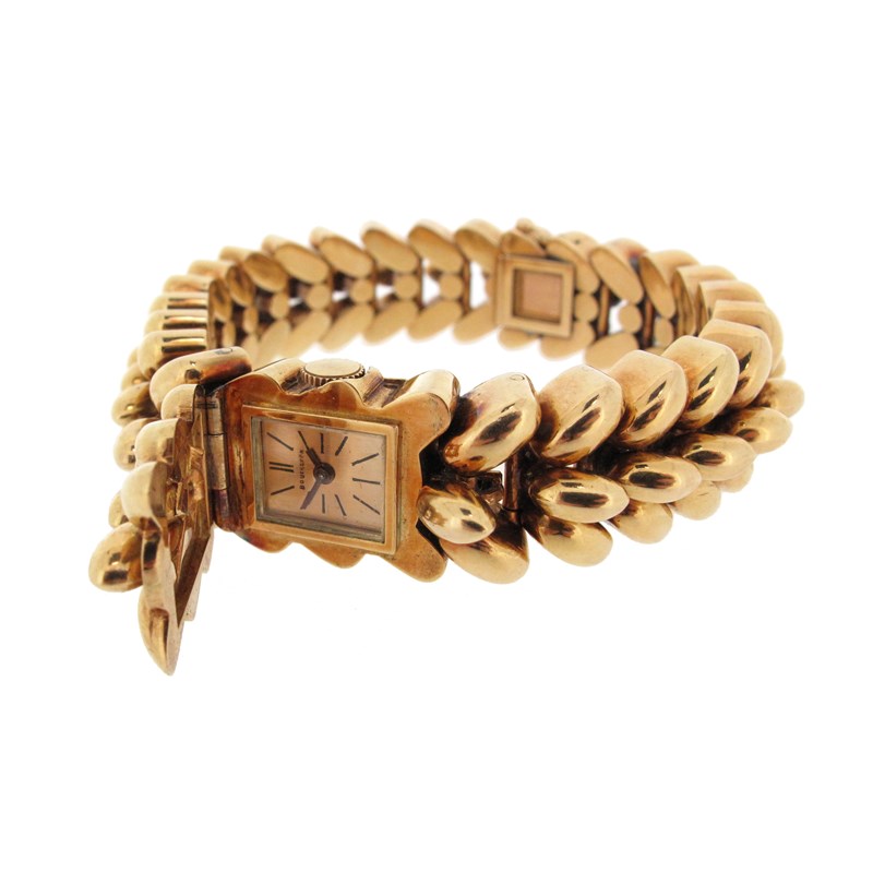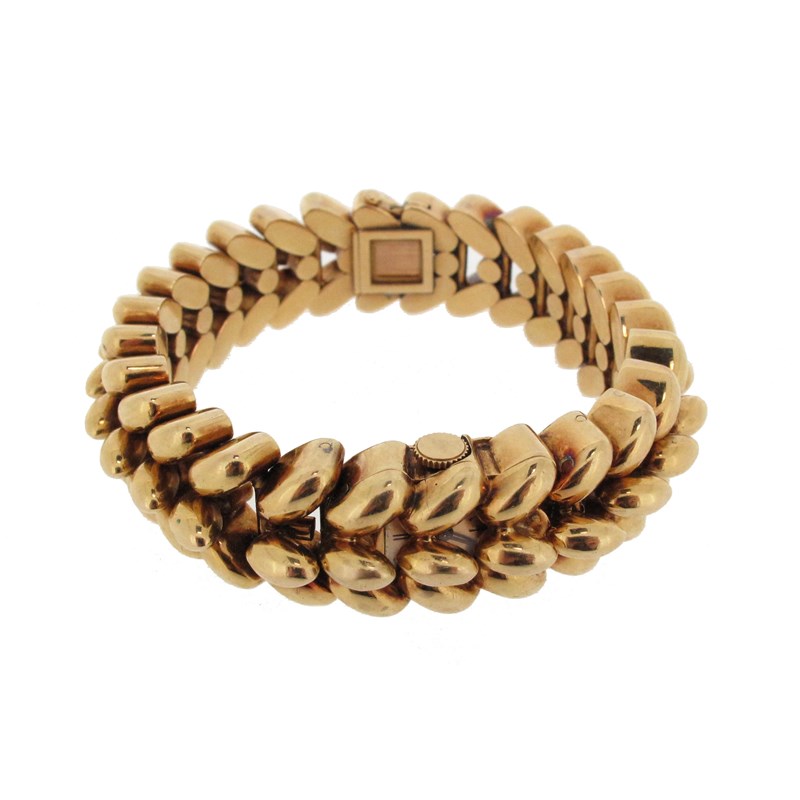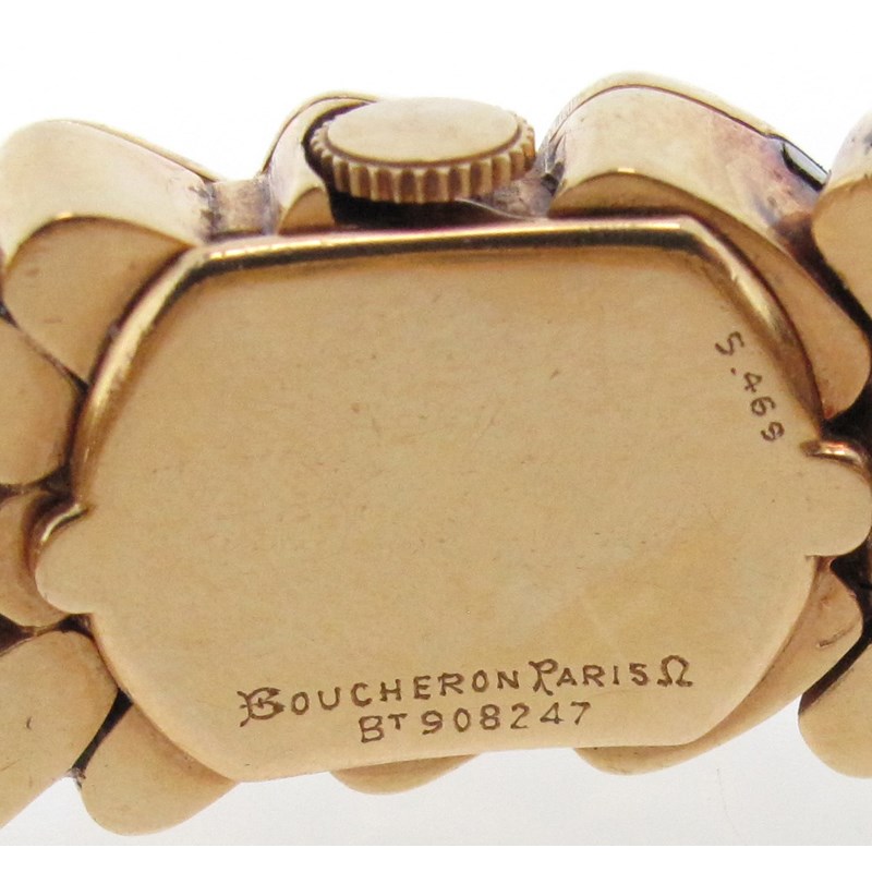 A gold Grains de Blé bracelet watch by Boucheron, the stylised wheatsheaf links set in yellow gold, with hidden compartment opening to reveal a watch, signed gold dial with baton numerals, manual winding, the bracelet signed to reverse and numbered 908247, 18.5cm long, 110g