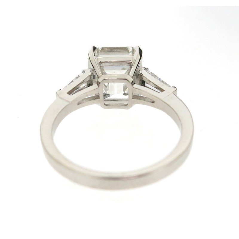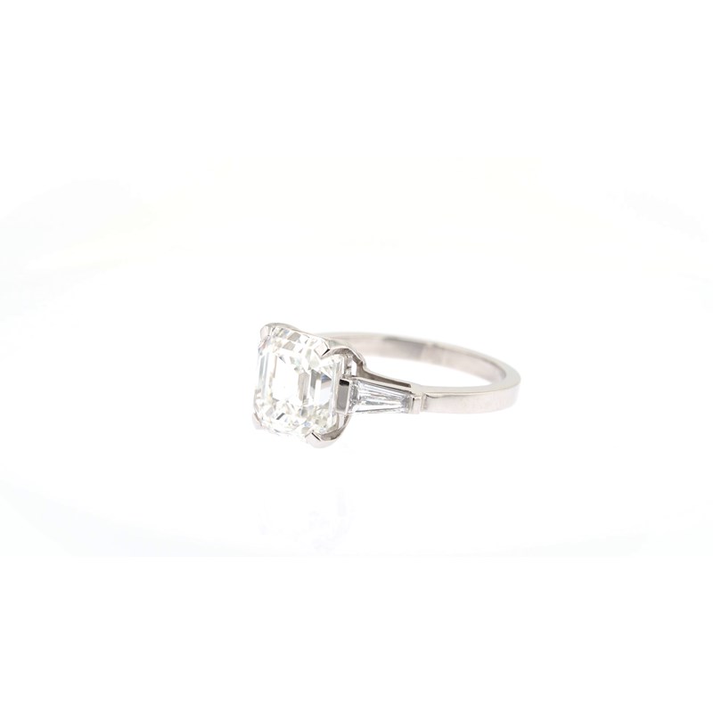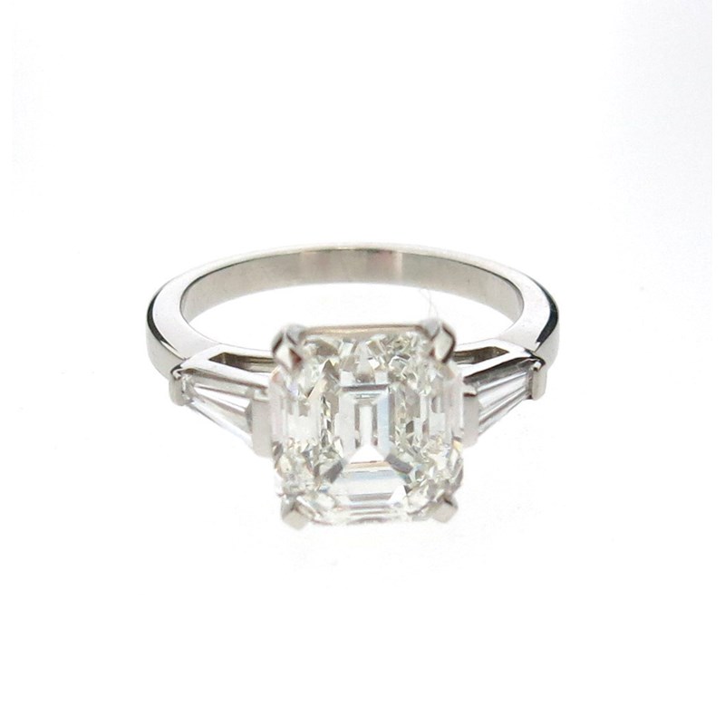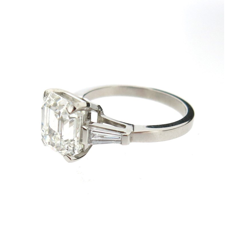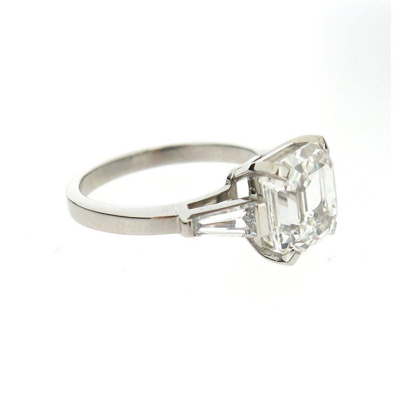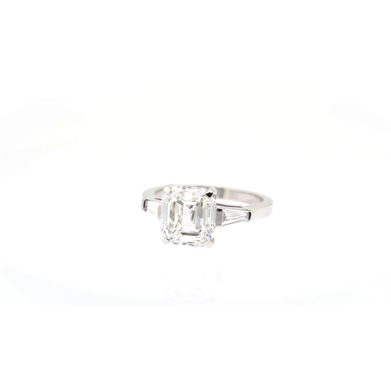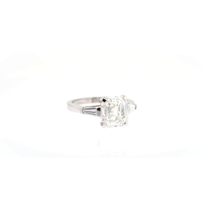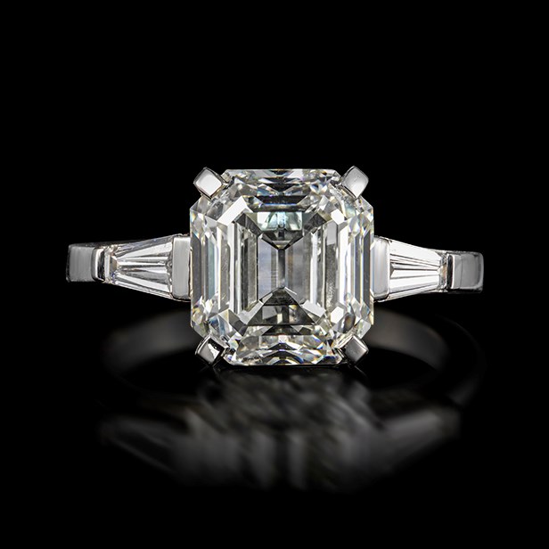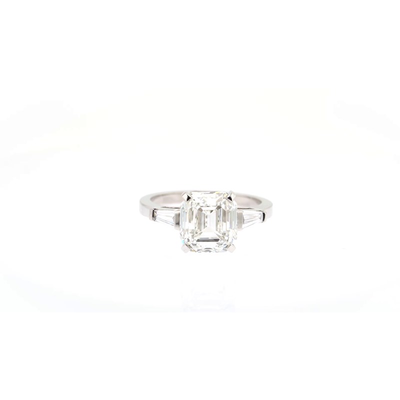 A diamond solitaire ring, the Asscher-cut diamond weighs 4.04cts, flanked with tapered baguette-shaped diamond shoulders in platinum, size L 1/2