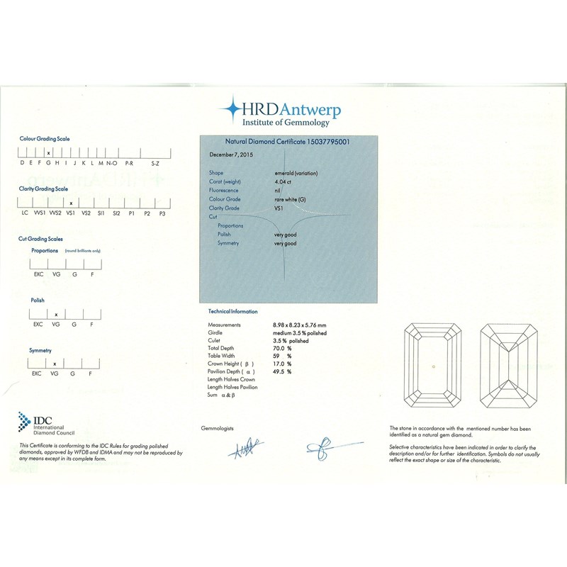 Accompanied by report number 15037795001 dated 7 December 2015 from HRD, Antwerp stating that the emerald variation-cut diamond weighs 4.04cts and is a natural diamond with G colour and VS1 clarity. Fluorescence: nil.