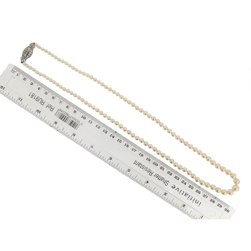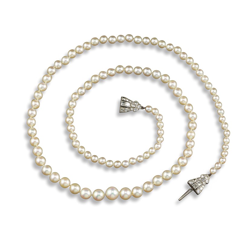 A single-row natural pearl necklace, the pearls graduate from 4.1-8.1mm with an Art Deco diamond-set platinum and white gold clasp, the clasp inscribed 'pat. no. 210520, 63.5cm long