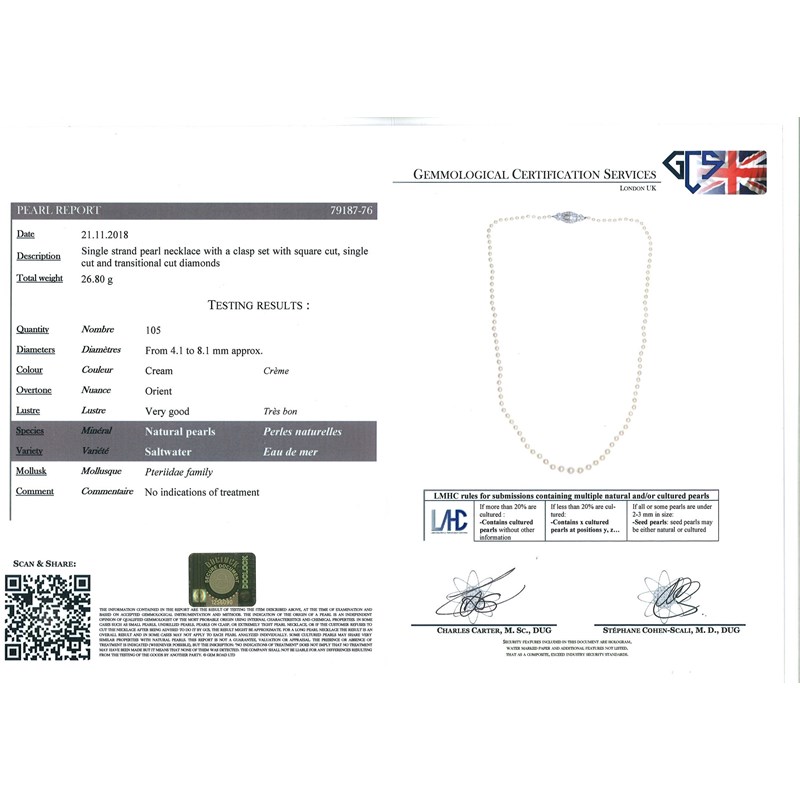 Accompanied by report number 79187-76 dated 21 November 2018 from GCS, London stating that the 105 pearls graduate from 4.1-8.1mm and are natural saltwater with no indications of treatment.