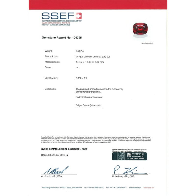 Accompanied by report number 104725 dated 6 Febraury 2019 from SSEF, Switzerland stating that the antique cushion, brilliant/step-cut spinel weighs 9.797cts and is a natural red spinel with no indications of treatment. Origin: Burma (Myanmar)