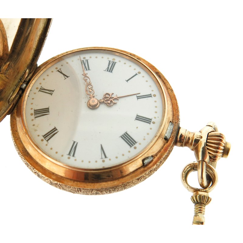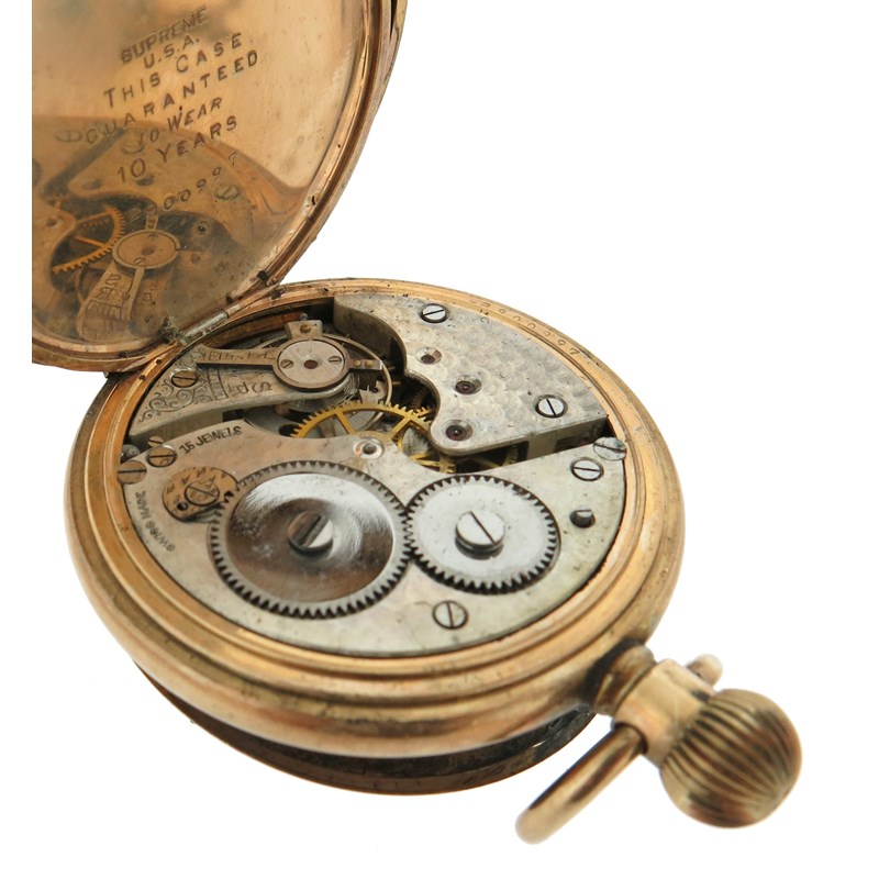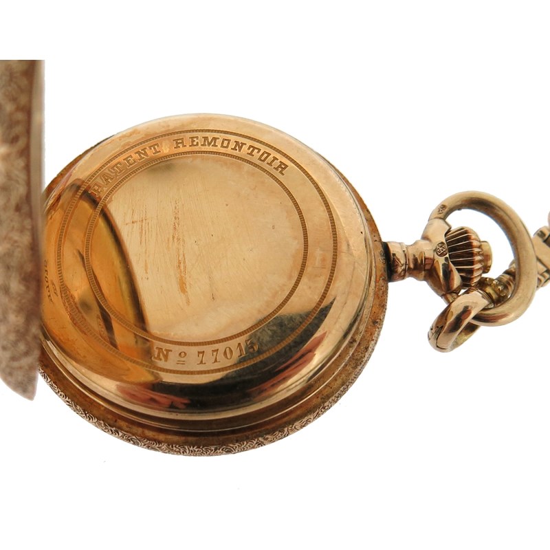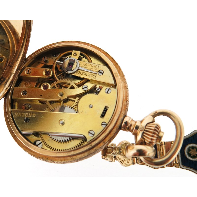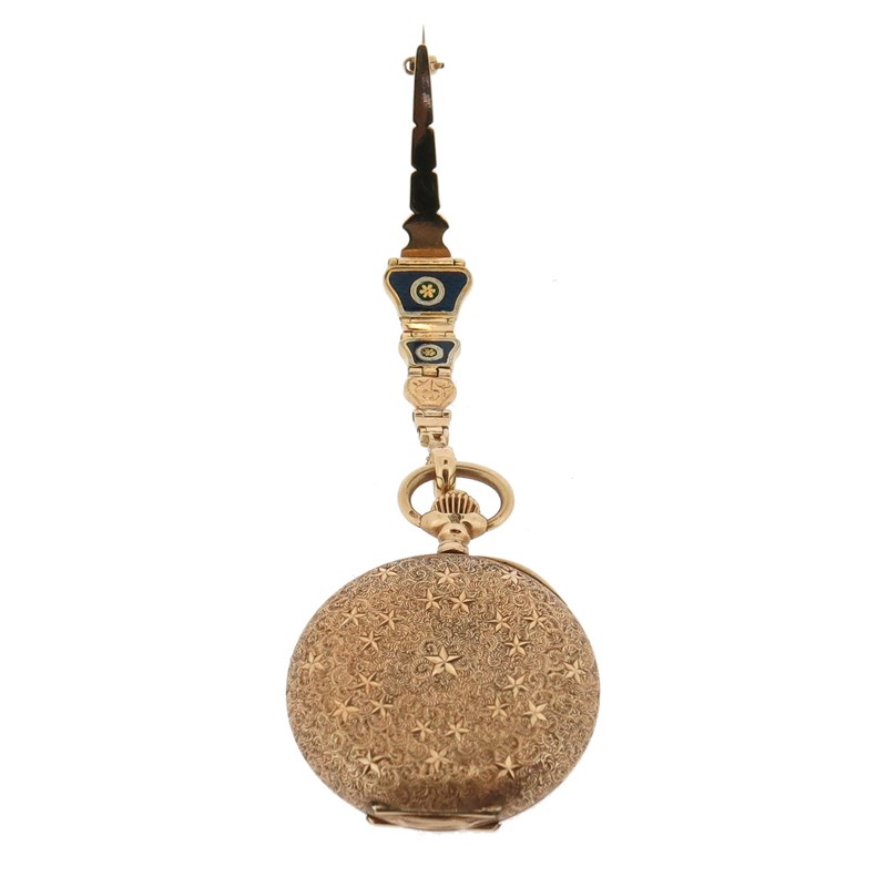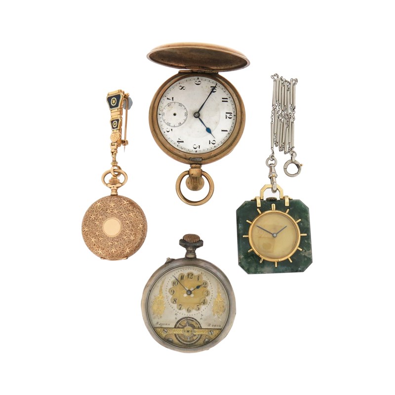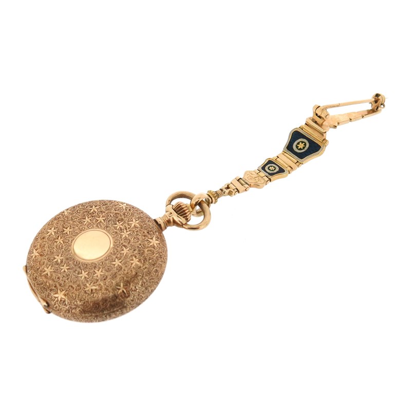 An early 20th century moss agate and gold fob watch, on platinum watch chain, with a lady's gold fob watch suspended from blue enamel and gold brooch, with a silver open faced pocket watch and a gold plated pocket watch