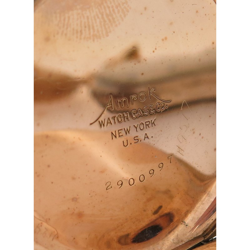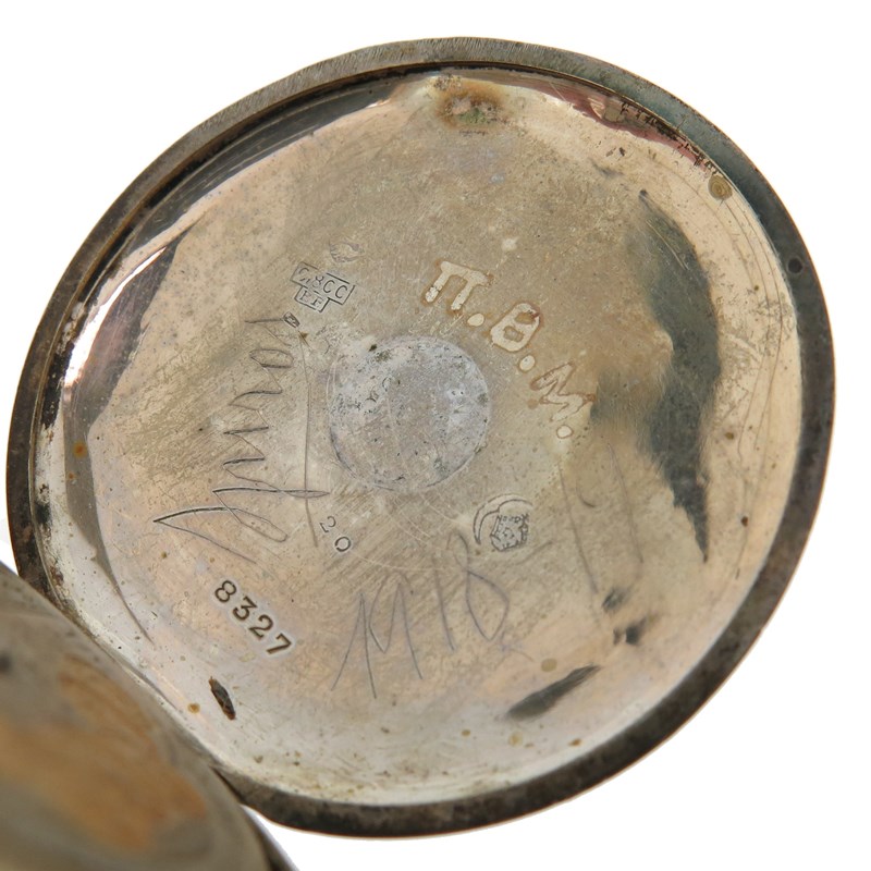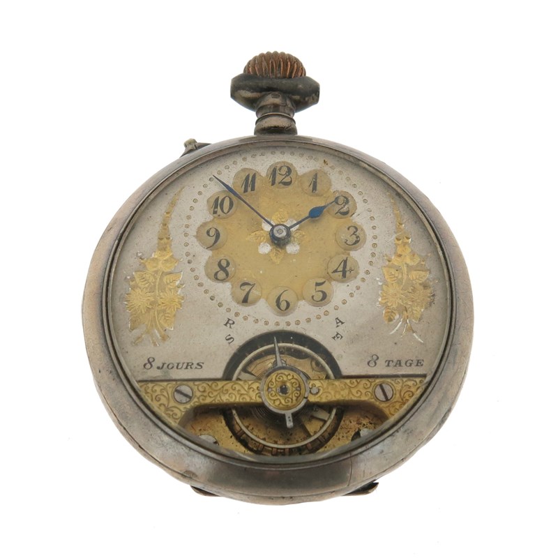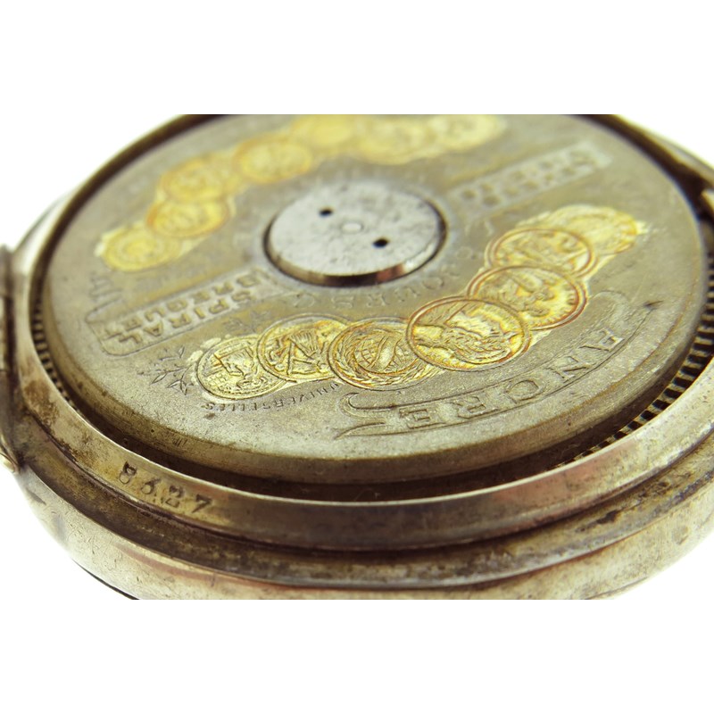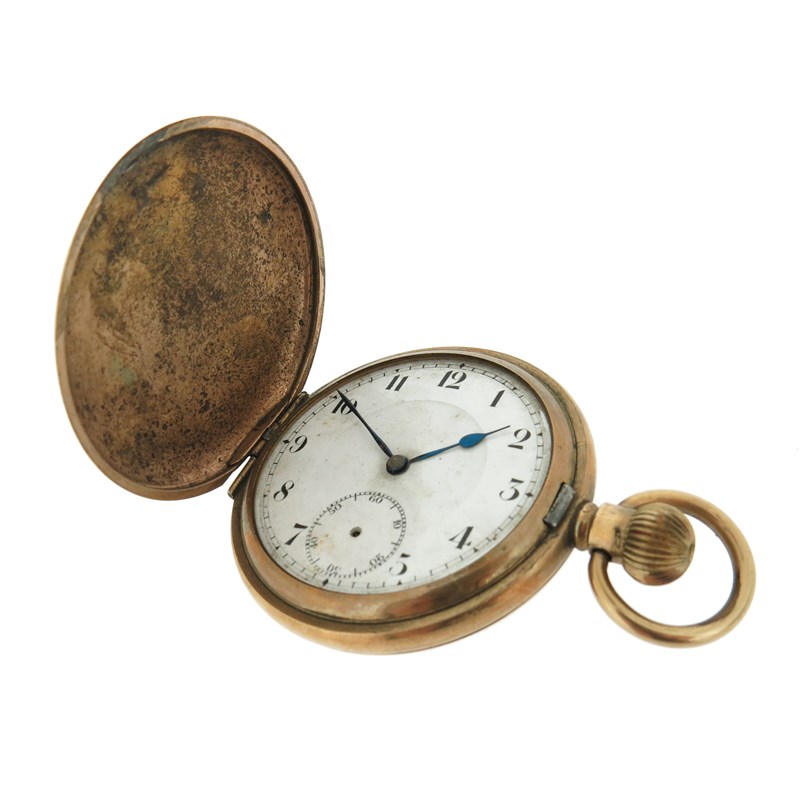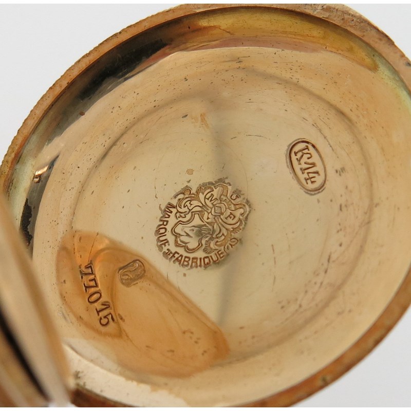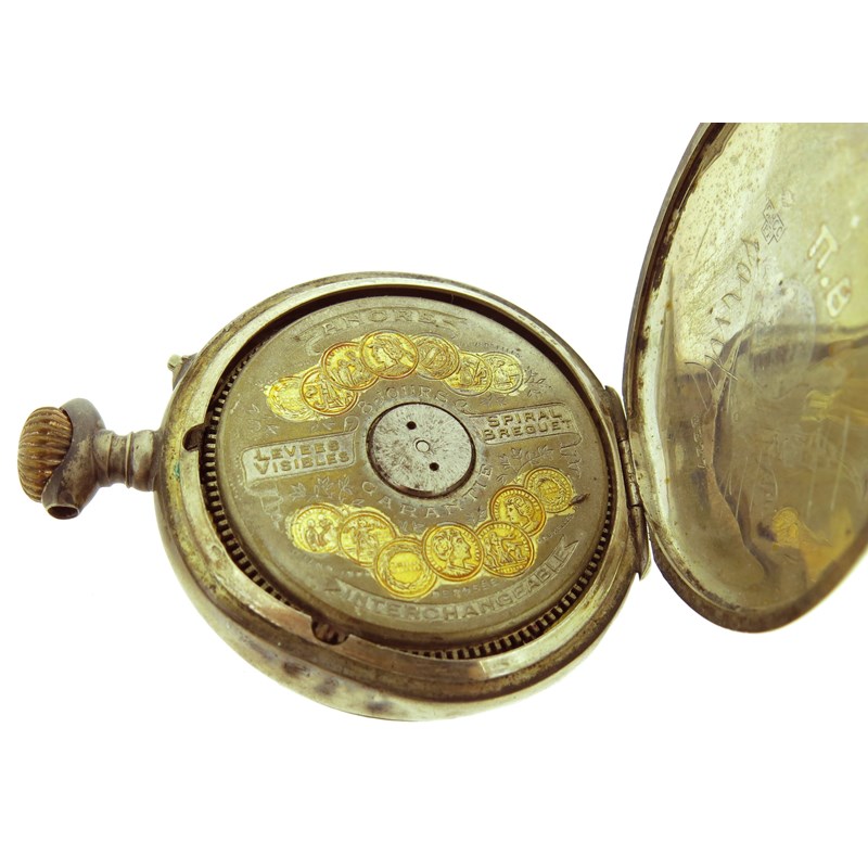 An early 20th century moss agate and gold fob watch, on platinum watch chain, with a lady's gold fob watch suspended from blue enamel and gold brooch, with a silver open faced pocket watch and a gold plated pocket watch