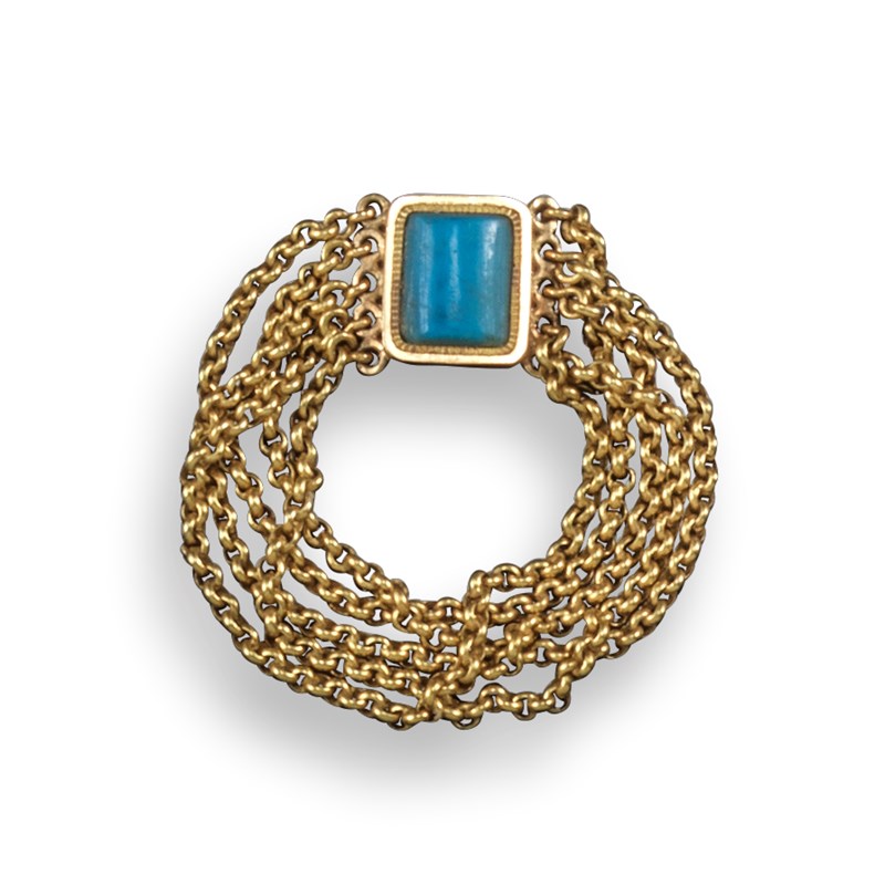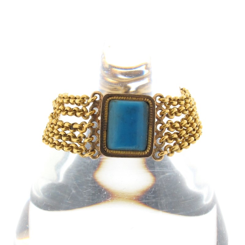 A George III turquoise and gold chain ring, the turquoise plaque set in closed-back yellow gold mount on a five row chain shank, size M approximately