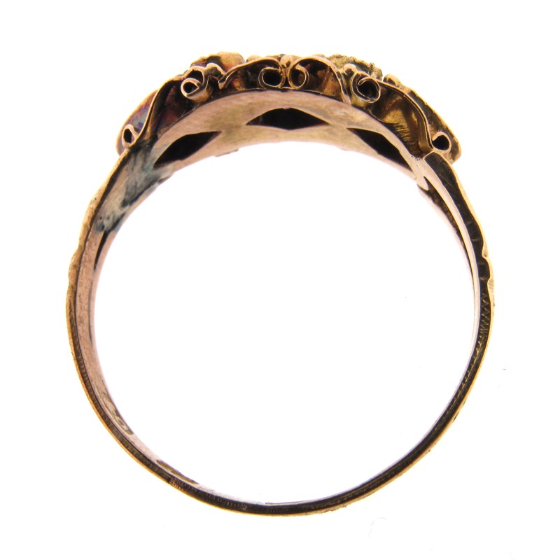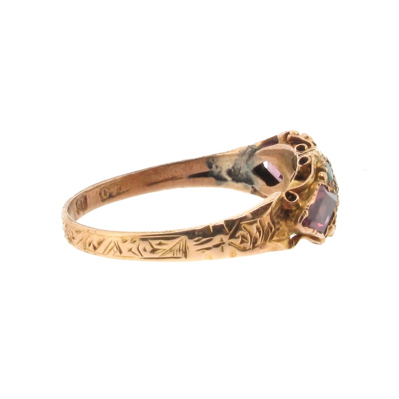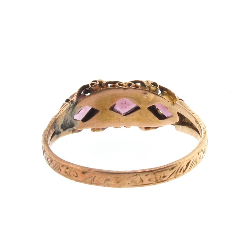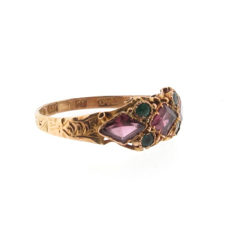 A 19th century amethyst and emerald ring, set in 15ct yellow gold scroll setting, Birmingham hallmarks for 1848, size P, case