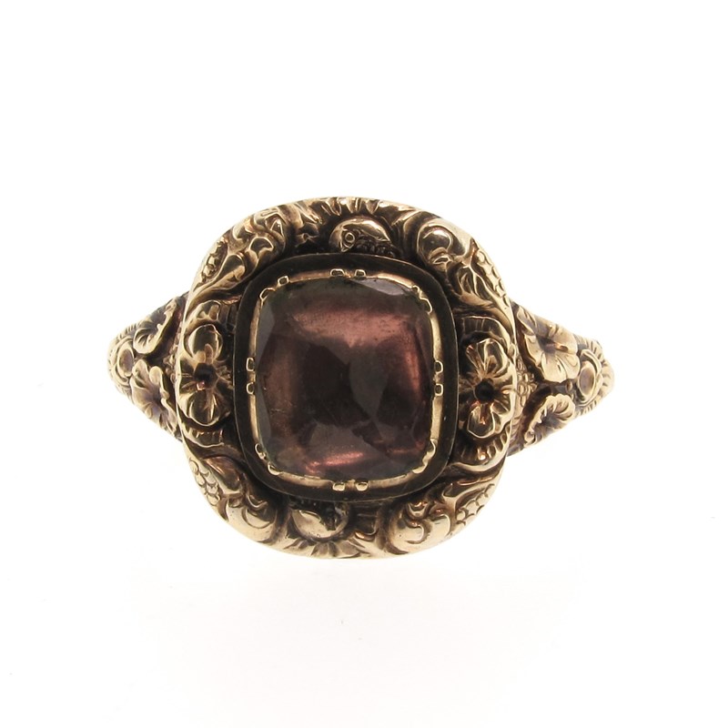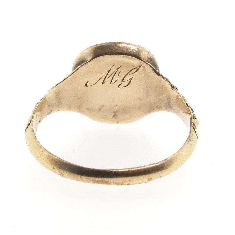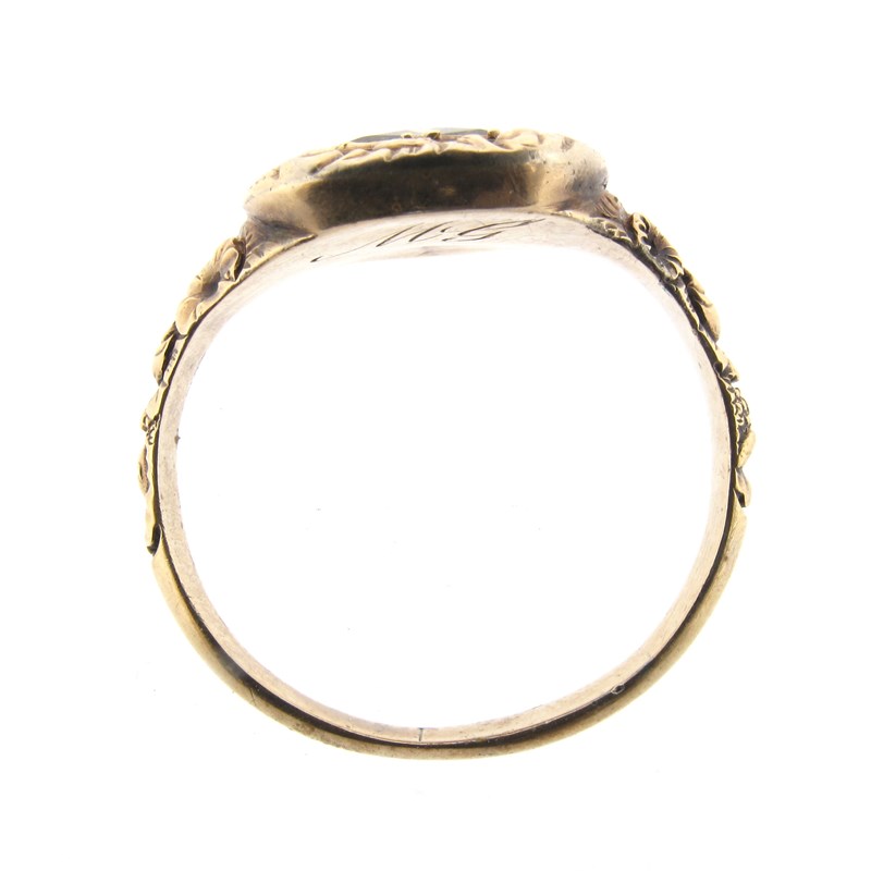 An early 19th century rock crystal ring, set in yellow gold closed back scroll mount, engraved M.G to interior, size S 1/2