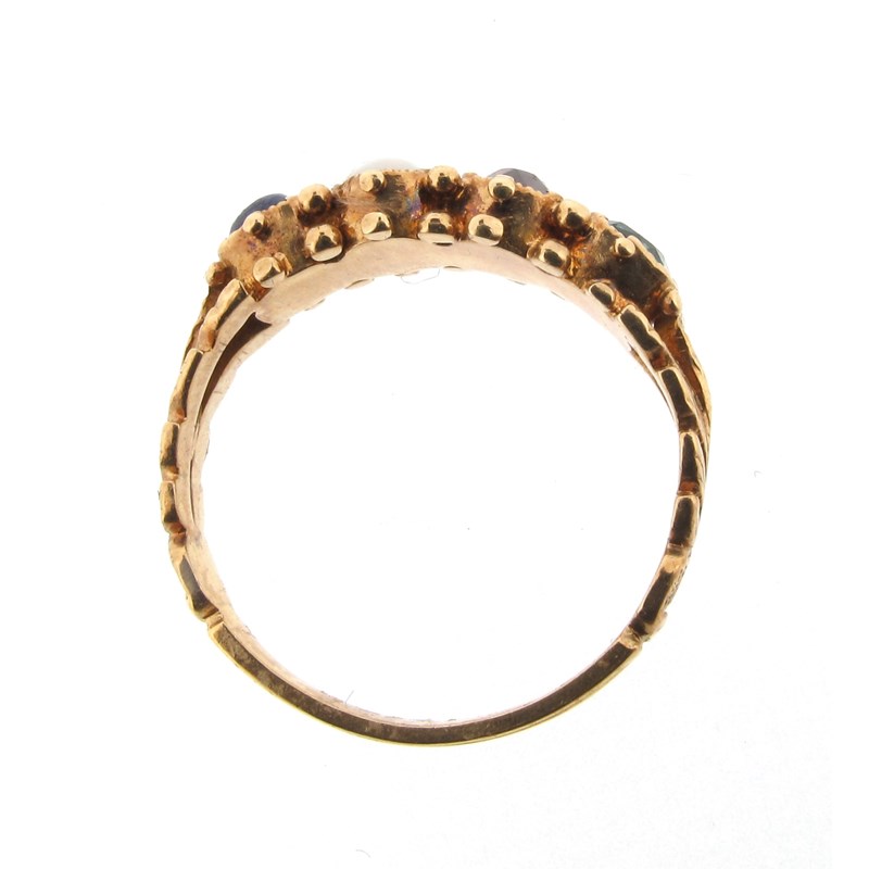 A 19th century acrostic ring, set with four gemstones spelling the word LOVE in lapis lazuli, opal, garnet and emerald in yellow gold scroll mount, size J