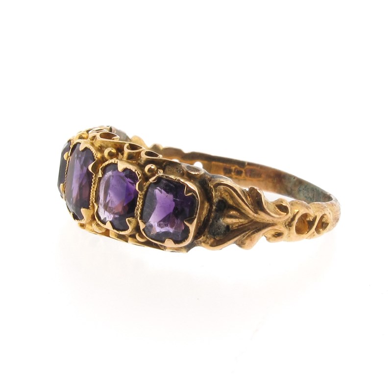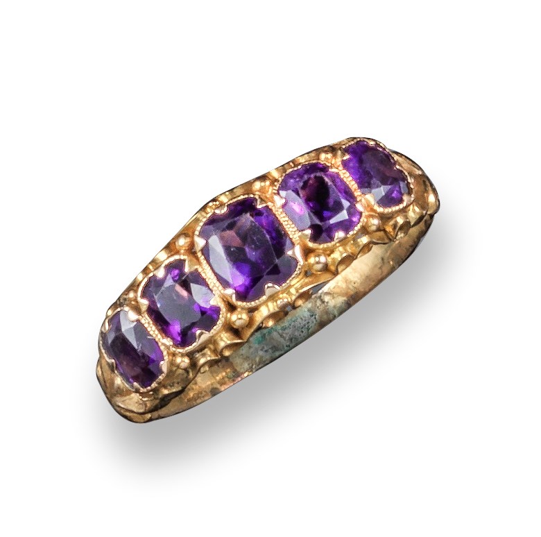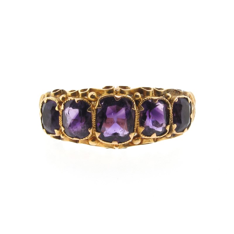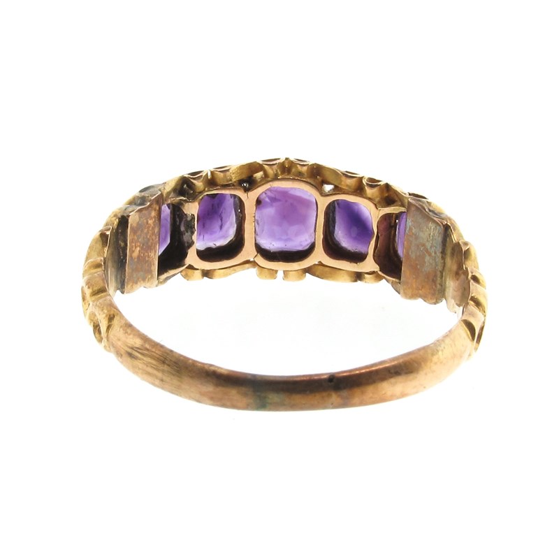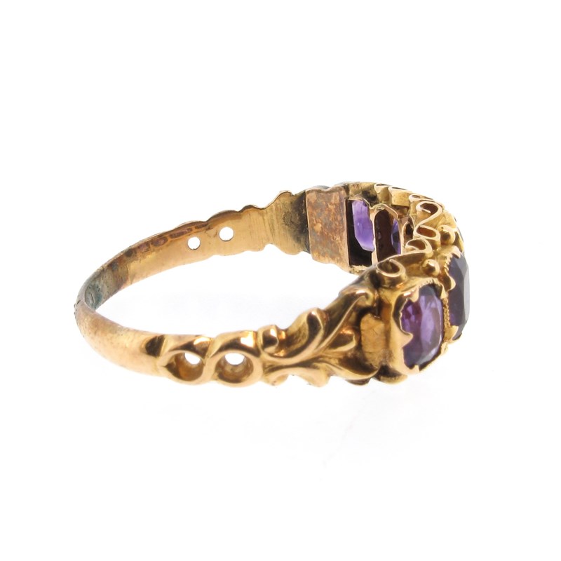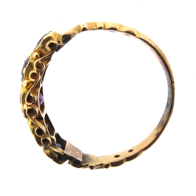 A 19th century amethyst half hoop ring, set in yellow gold scroll mount, size Q