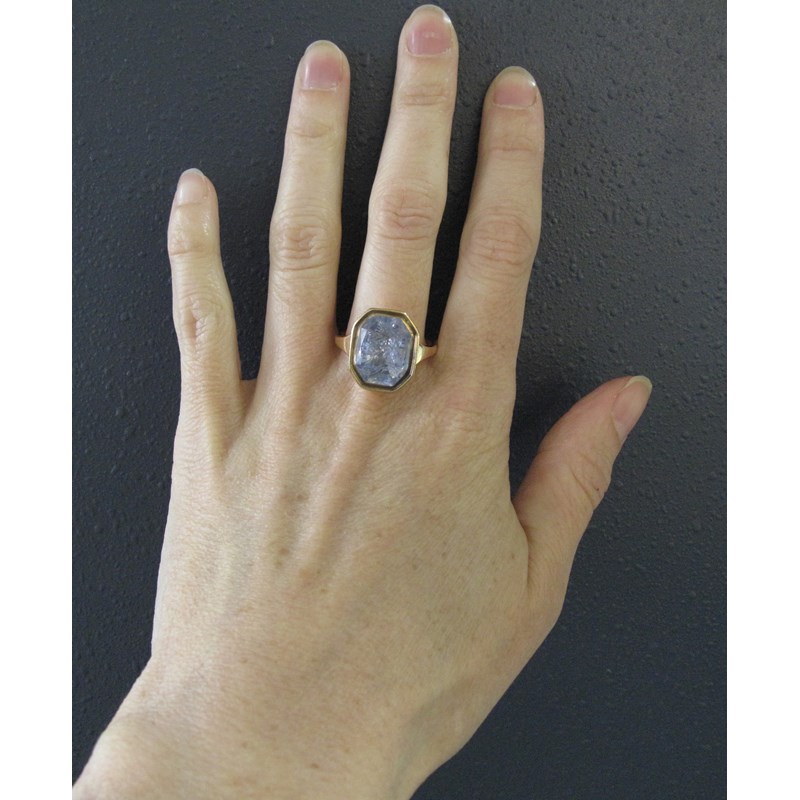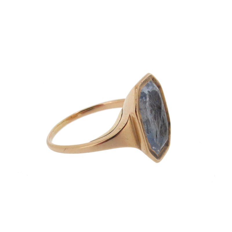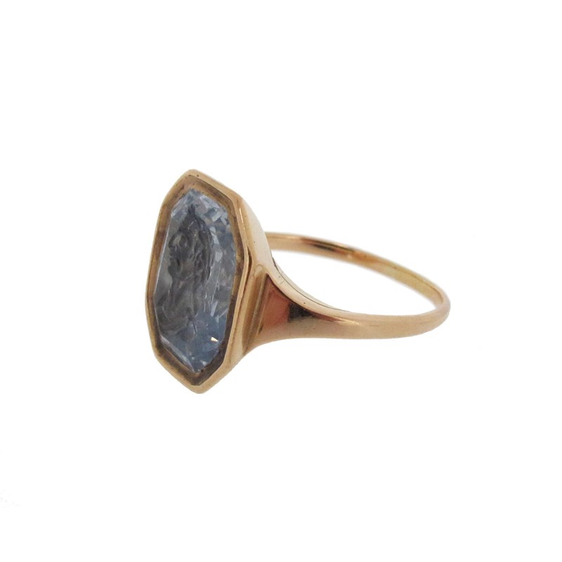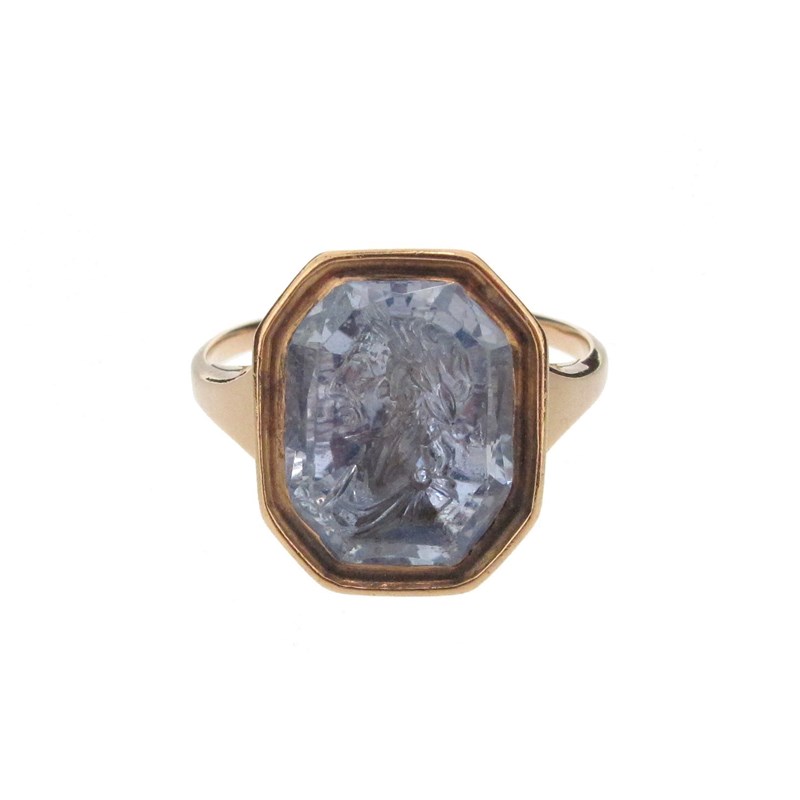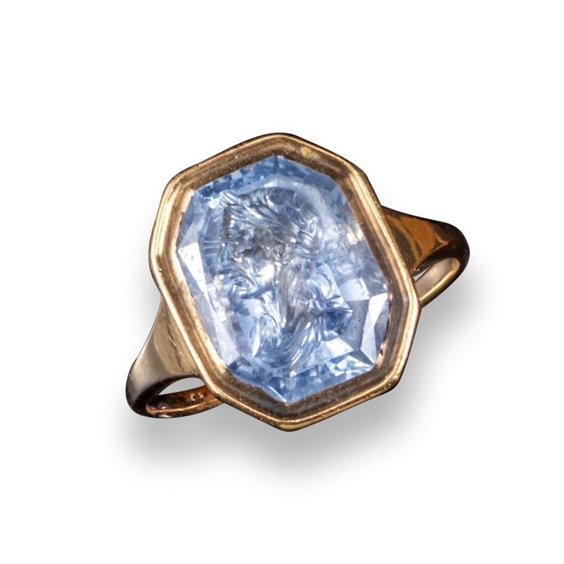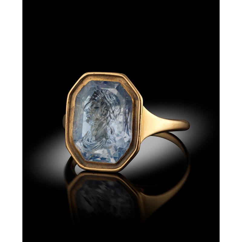 A Renaissance carved sapphire intaglio, depicting Julius Caesar, the octagonal sapphire 1.5cm high, mounted in a later gold ring, size P 1/2