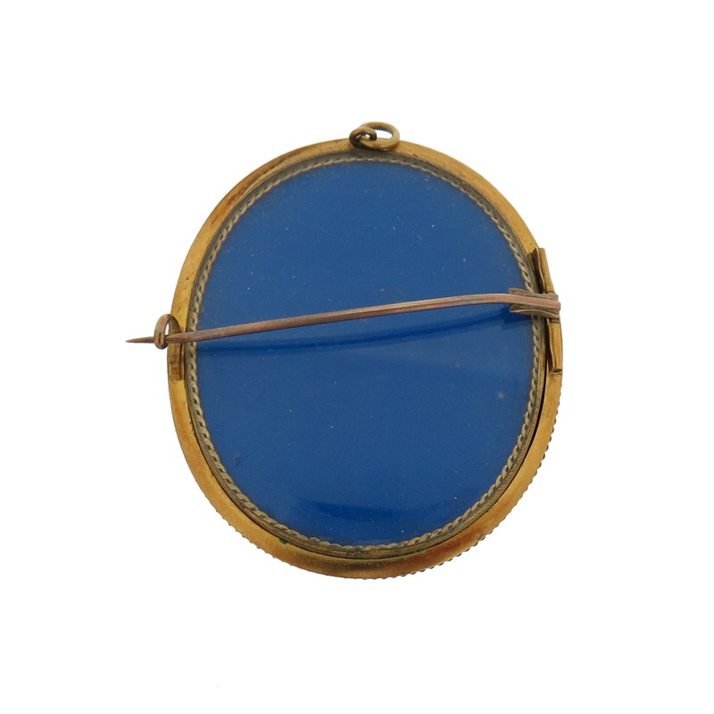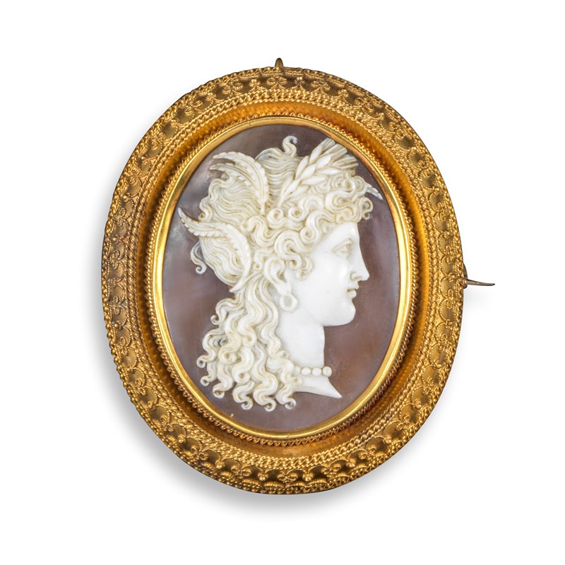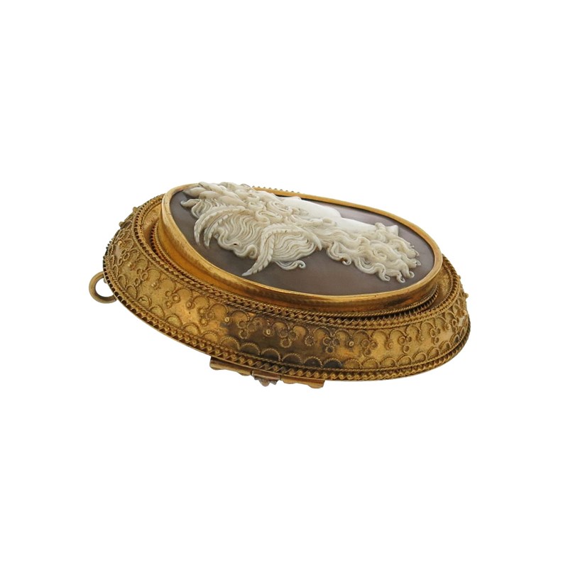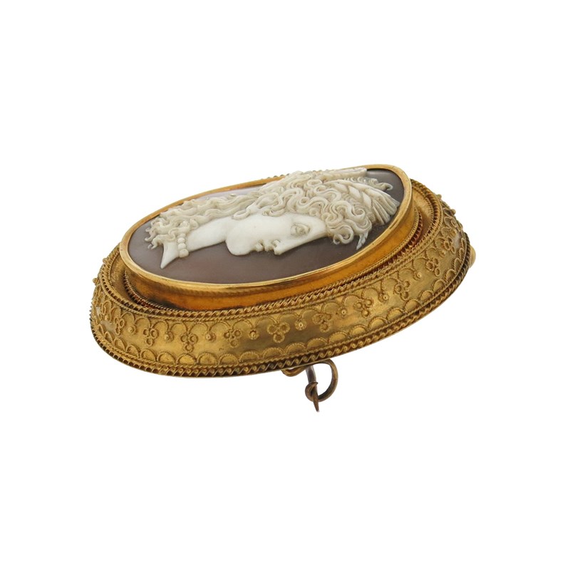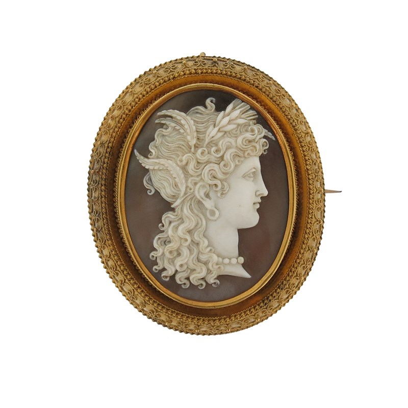 A 19th century shell cameo brooch, depicting Ceres in profile, within an Etruscan Revival ornate gold frame, glazed compartment to reverse, 5.6cm high
