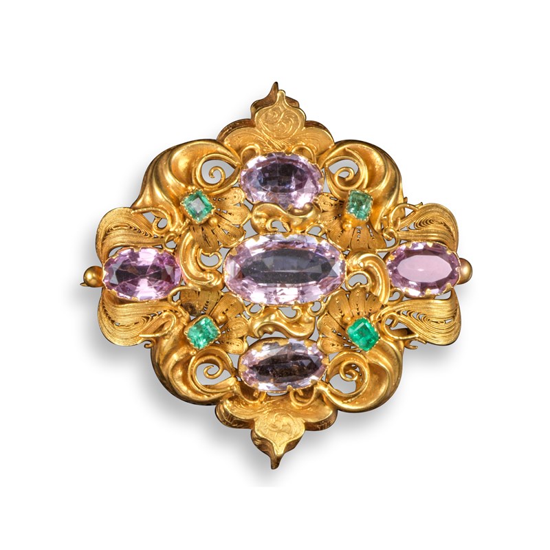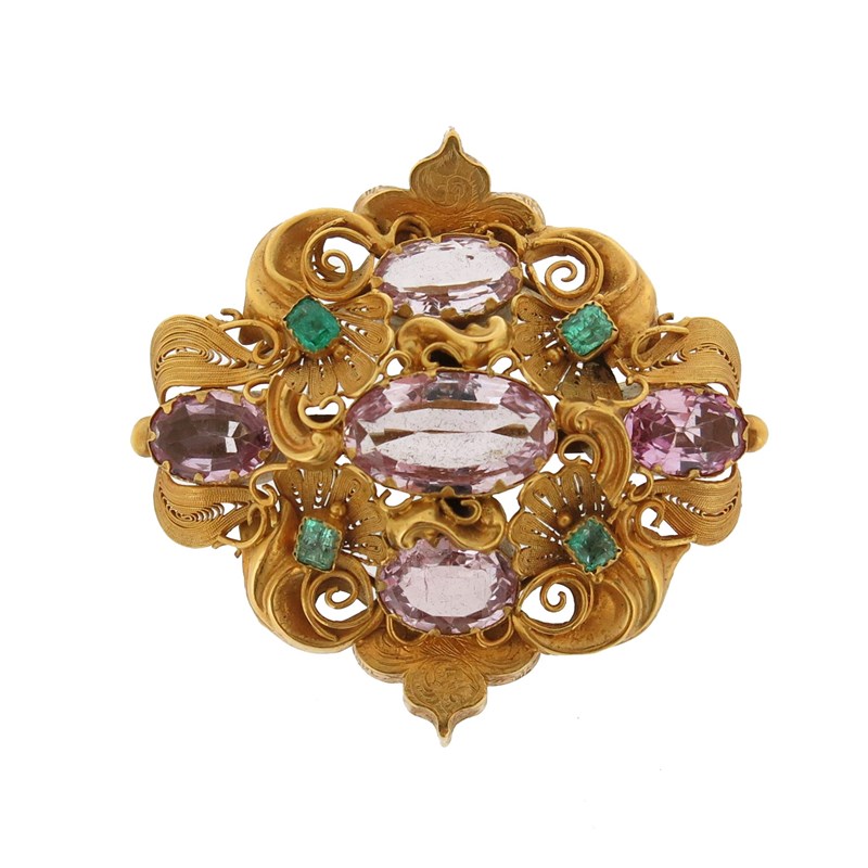 A Regency pink topaz and emerald gold brooch