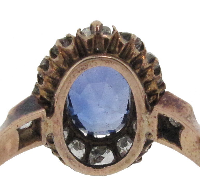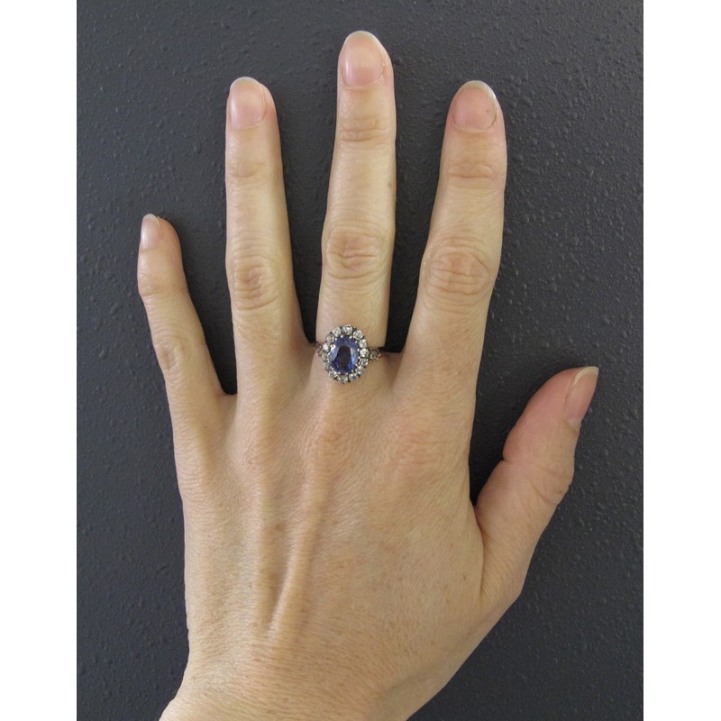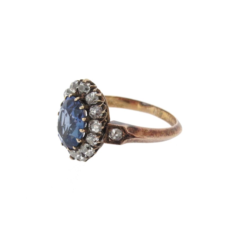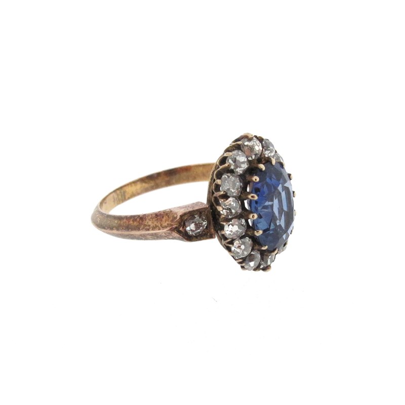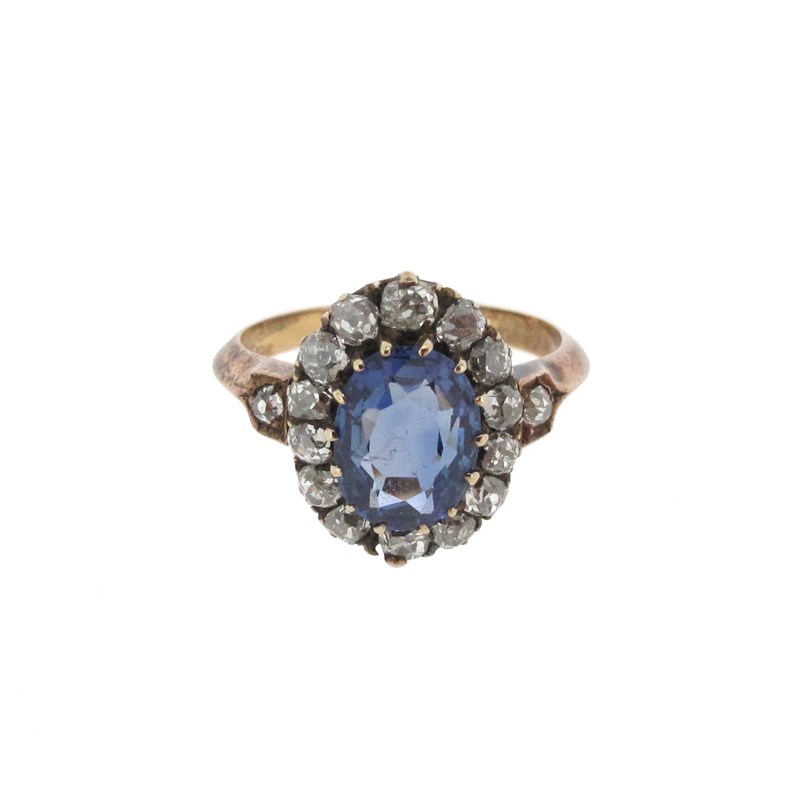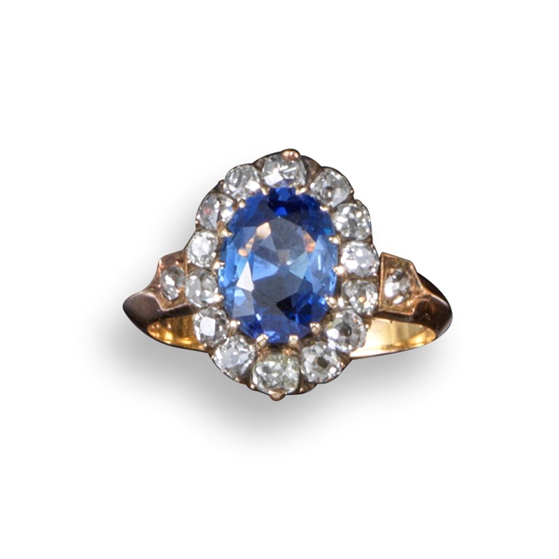A late Victorian sapphire and diamond cluster ring, the oval-shaped sapphire set within a surround of cushion-shaped diamonds, with a further cushion-shaped diamond to each shoulder in yellow gold, size L 1/2