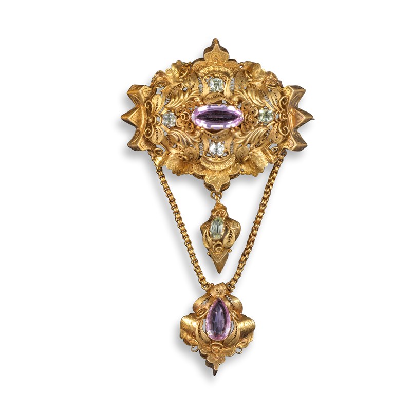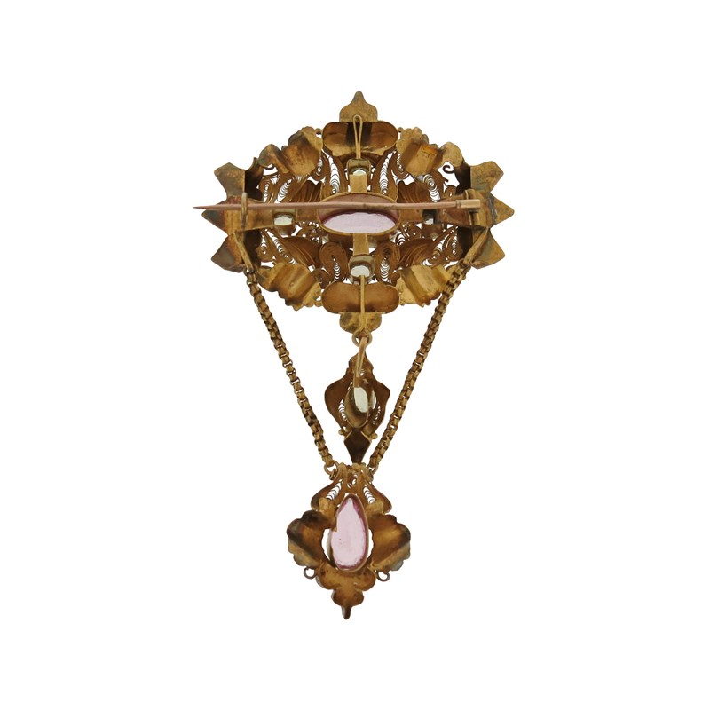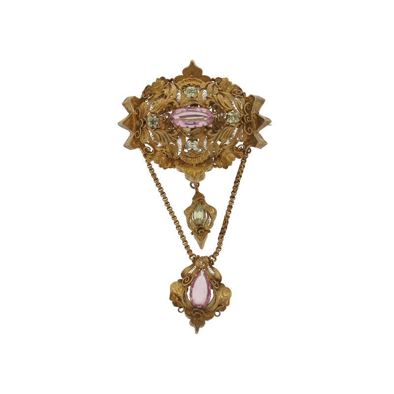 A Regency gold brooch, set with pink topaz and chrysolites in cannetille border, 9cm high, case