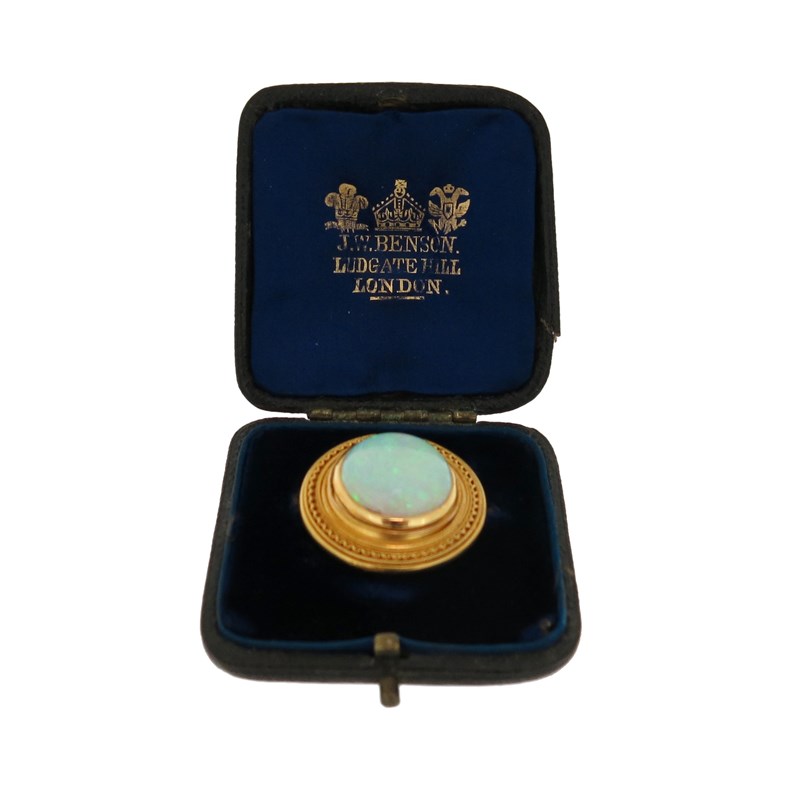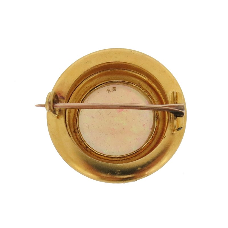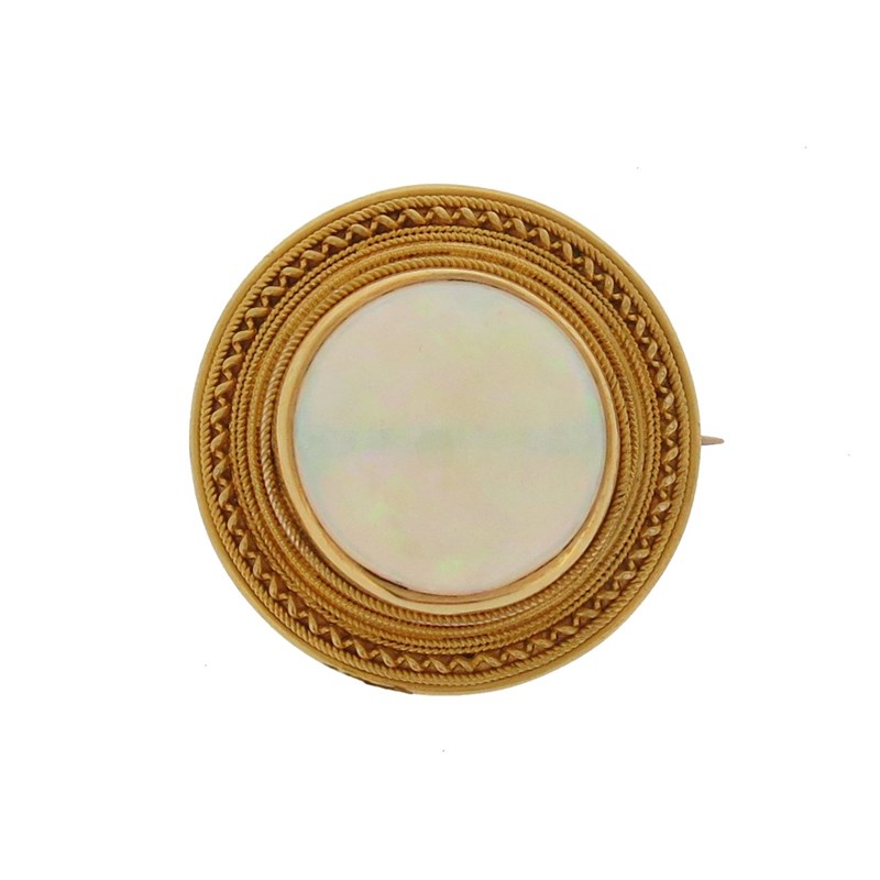 A Victorian Etruscan Revival gold brooch, set with a round solid white opal cabochon within ropetwist yellow gold border, 2.7cm wide, fitted case