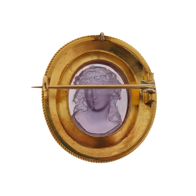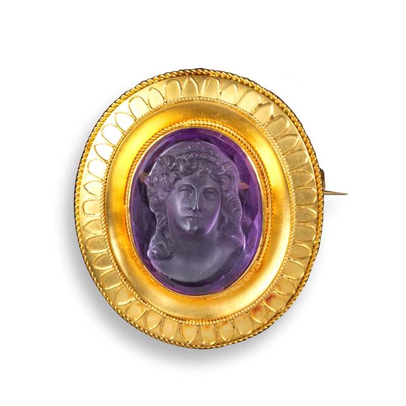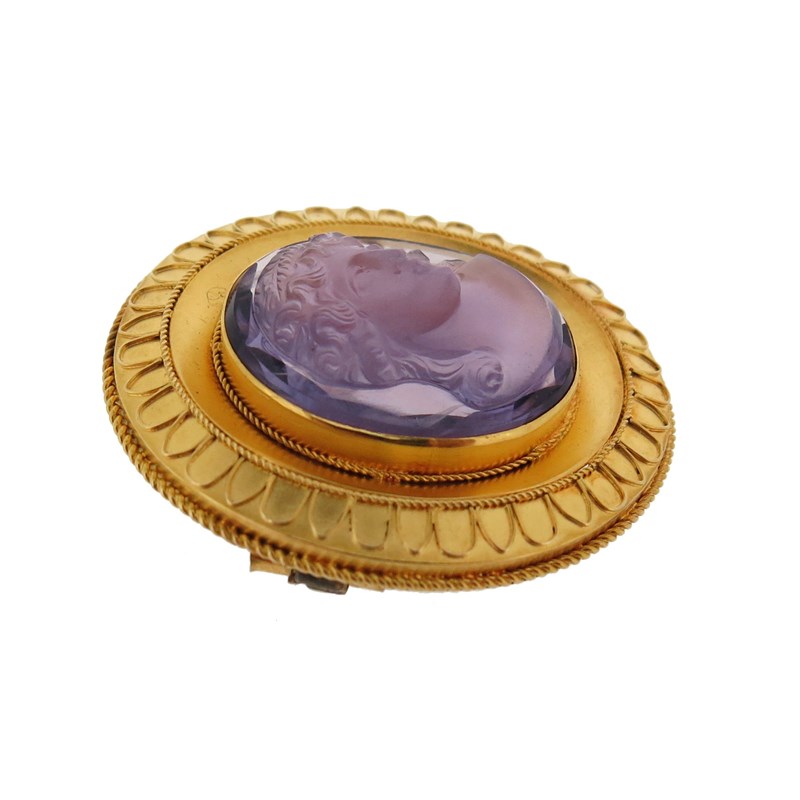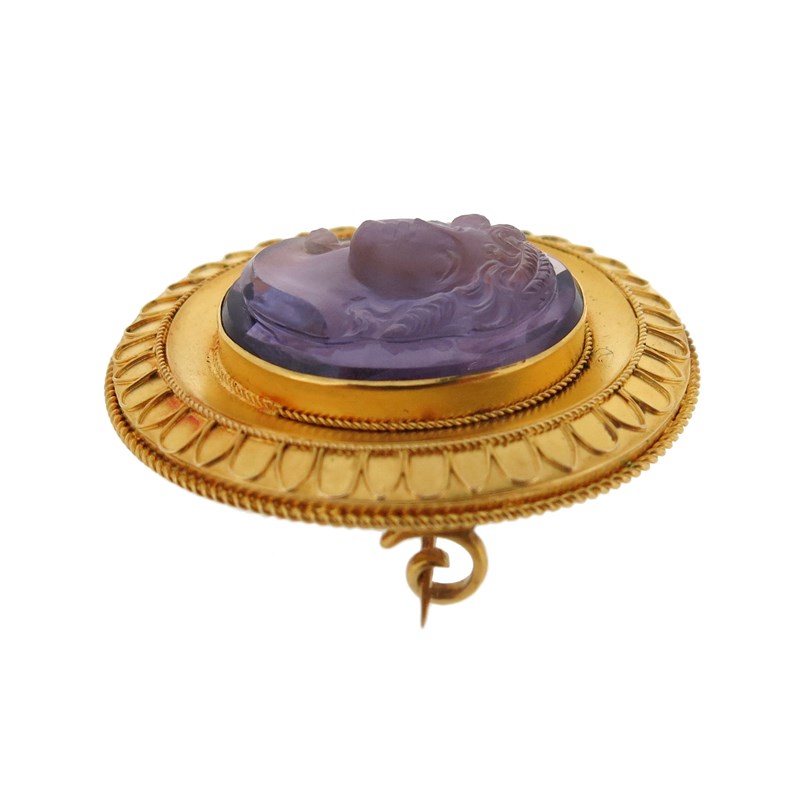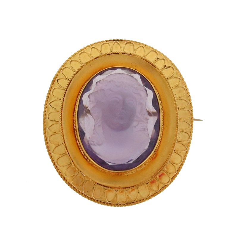 A carved amethyst cameo brooch