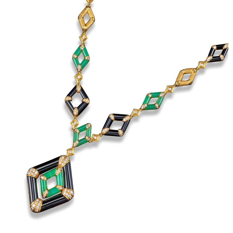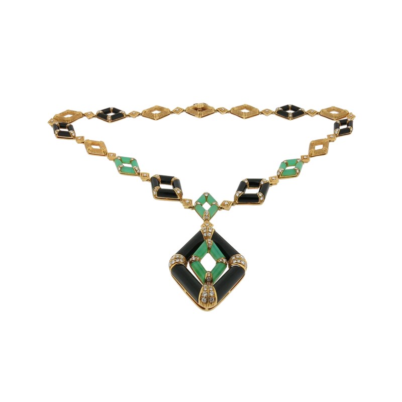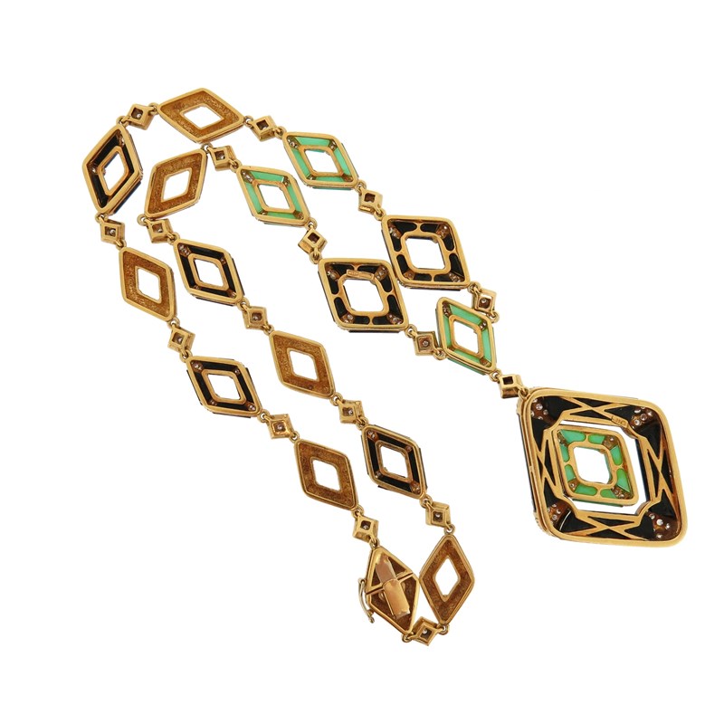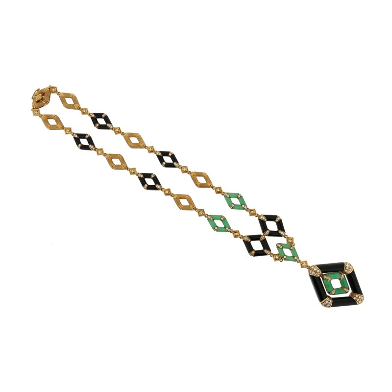 A chalcedony, onyx and diamond necklace, the pendant formed from an articulated chalcedony lozenge within an onyx lozenge, quartered with diamonds, suspending from a conforming necklace, 48cm long